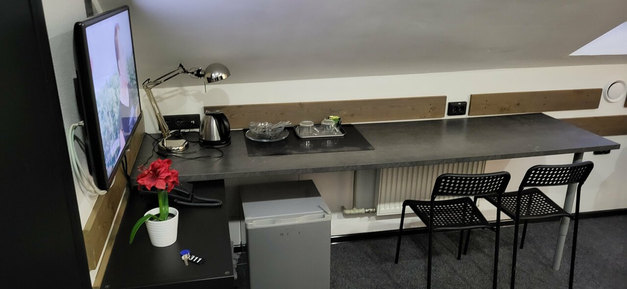 Номер чистый.Есть чайник.холодильник, фен, полотенца.Шампунь и гель для душа.Близко к центру.Все понравилось.