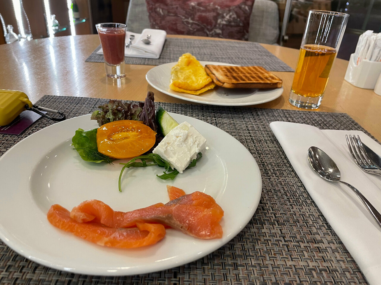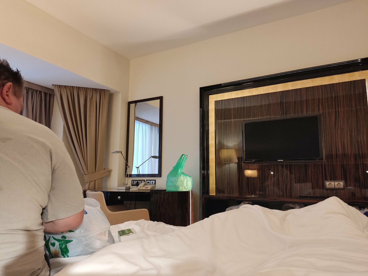 Просторный номер с большой двуспальной кроватью. В номере чисто, есть всё необходимое — холодильник, чайник, утюг. Был включён завтрак в ресторане отеля. Шведский стол — большой выбор на любой вкус.