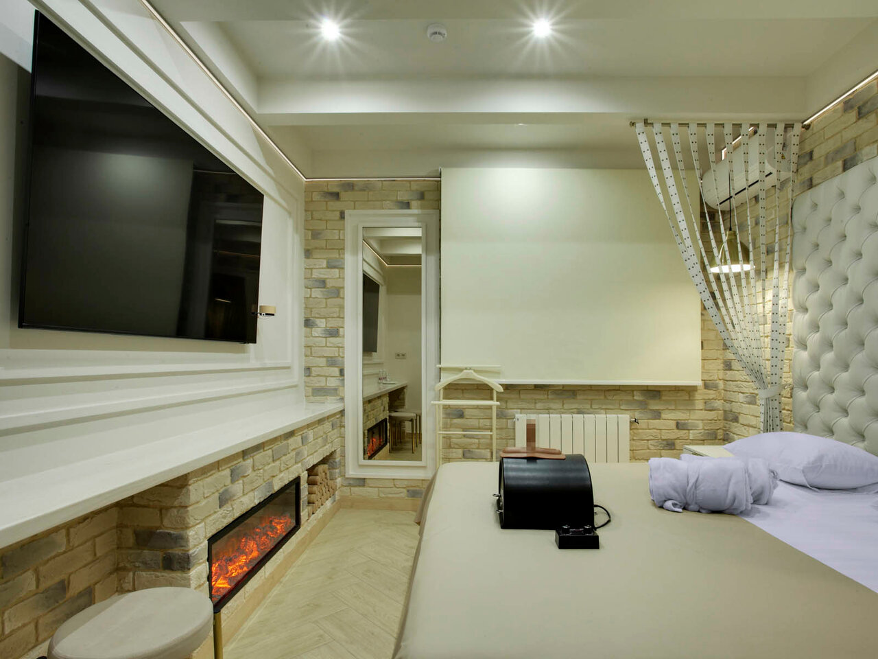 Cамая просторная комната с камином и гостиной зоной. Есть балкон в тихий дворик со столиком и стульями. В комнате к вашим услугам чайный набор, посуда, бокалы.
