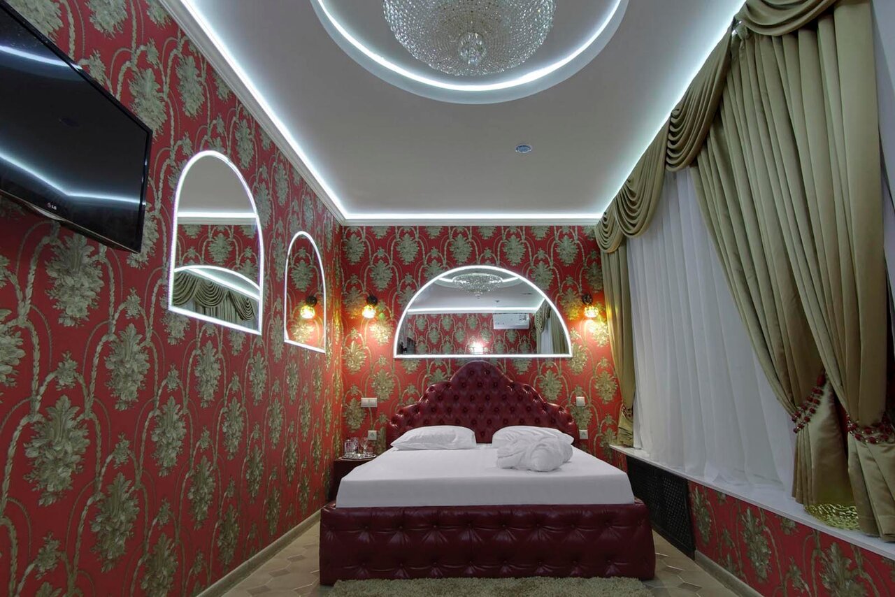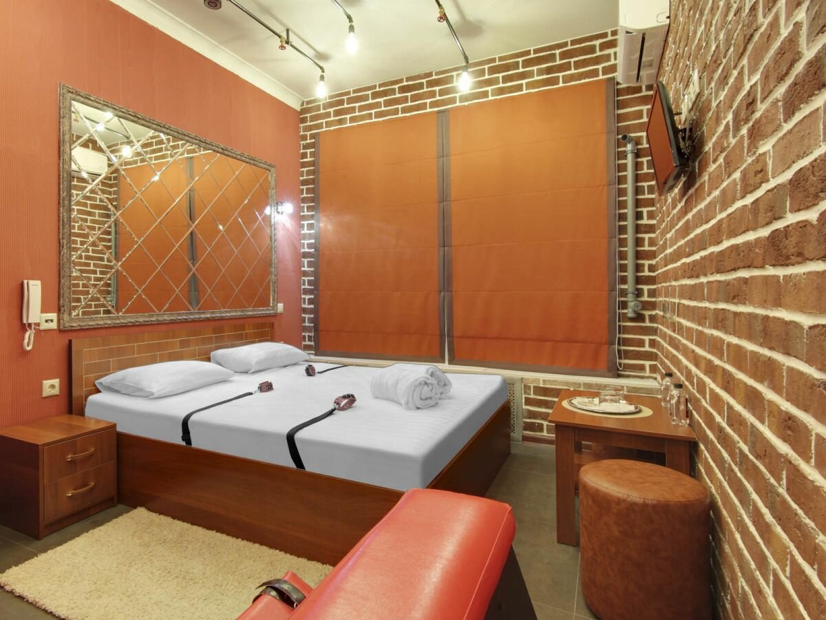 Стоимость:Час - 1200 р.Ночь (00:00 - 12:00) - 4500 р.Сутки (14:00 - 12:00) - 6500 р.Размер 22 - 28 кв. м.Большая кровать King-sizeДизайнерский стол2 стулаТелевизорСанузелХалаты, полотенца и мыльные принадлежностиКондиционе