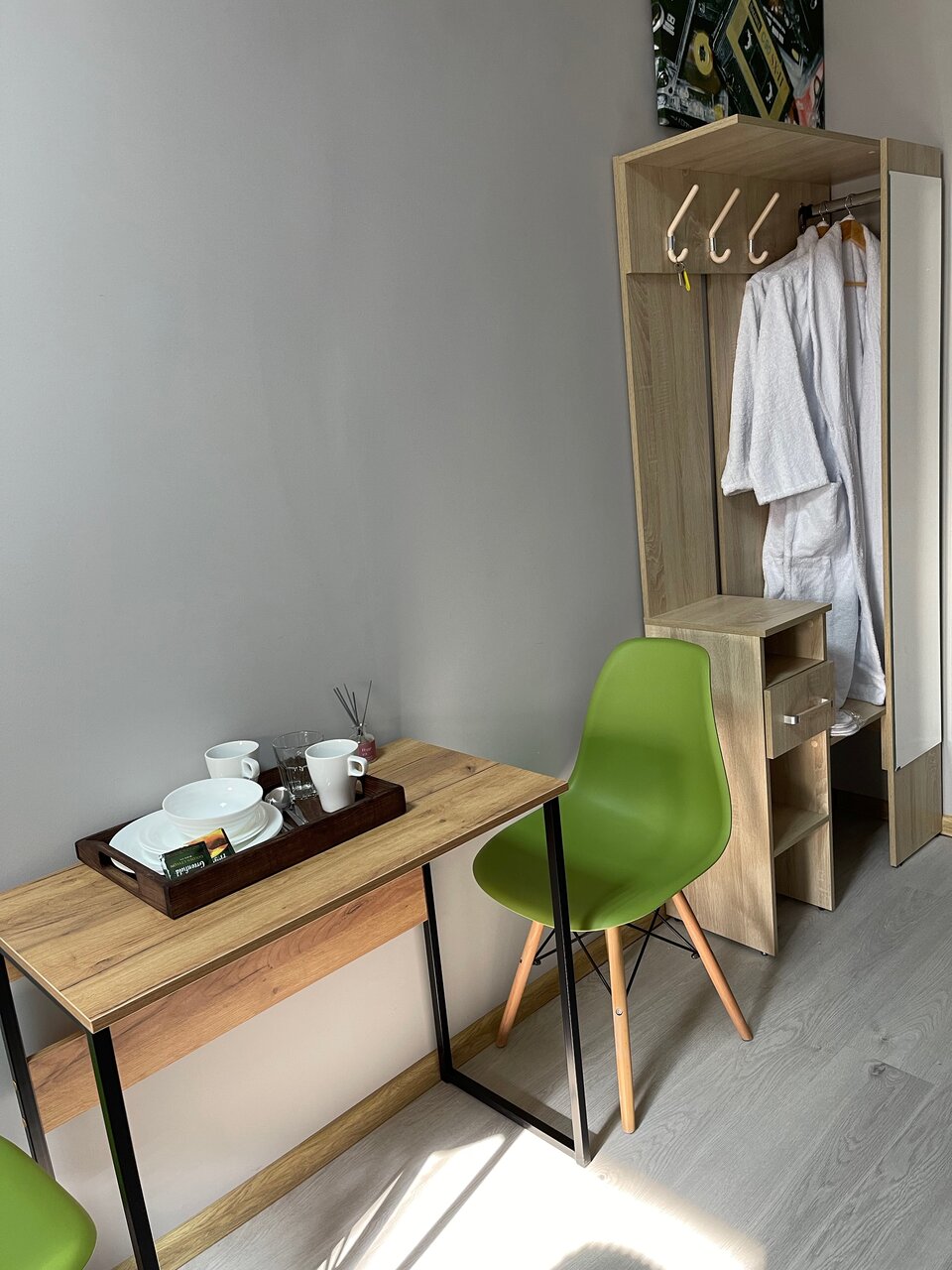 Отличный хостел! Советую всем! Чисто, уютно, очень красиво. На каждого человека выдают по 3 полотенца, халат и тапочки. Каждый день приносили бутылочки с водой, чай, шампунь, гель д/душа, зубные щетки.У нас был номер-аппартаменты #35 на 3 этаже, угловой, просторный, светлый, уютный со своей мини-кухней и сан.узлом. Отличное месторасположение, это в самом сердце Москвы, 3 мин.до Красной площади и ГУМа, рядом парк Зарядье. Всё в пешей доступности. Хотя была своя кухня, обедали в кафе Теремок за углом хостела на Никольской улице.