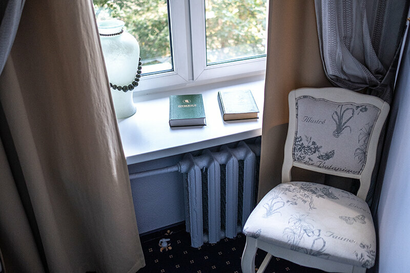 - Чистые номера и приятный дизайн (цветочки на кроватях, книги на подоконнике).