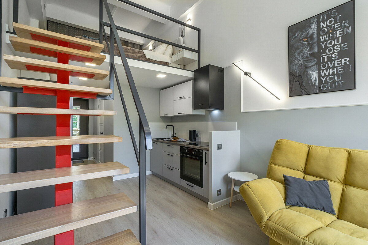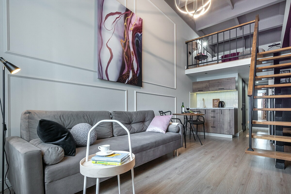 Двухуровневый апартамент Санни с дизайнерским ремонтом.Подходит для семейного отдыха, а так же для командировки. Прекрасный интерьер, сервис и чистота. Полностью оборудованы всем необходимым: техника, посуда, постельные принадлежности, полотен...