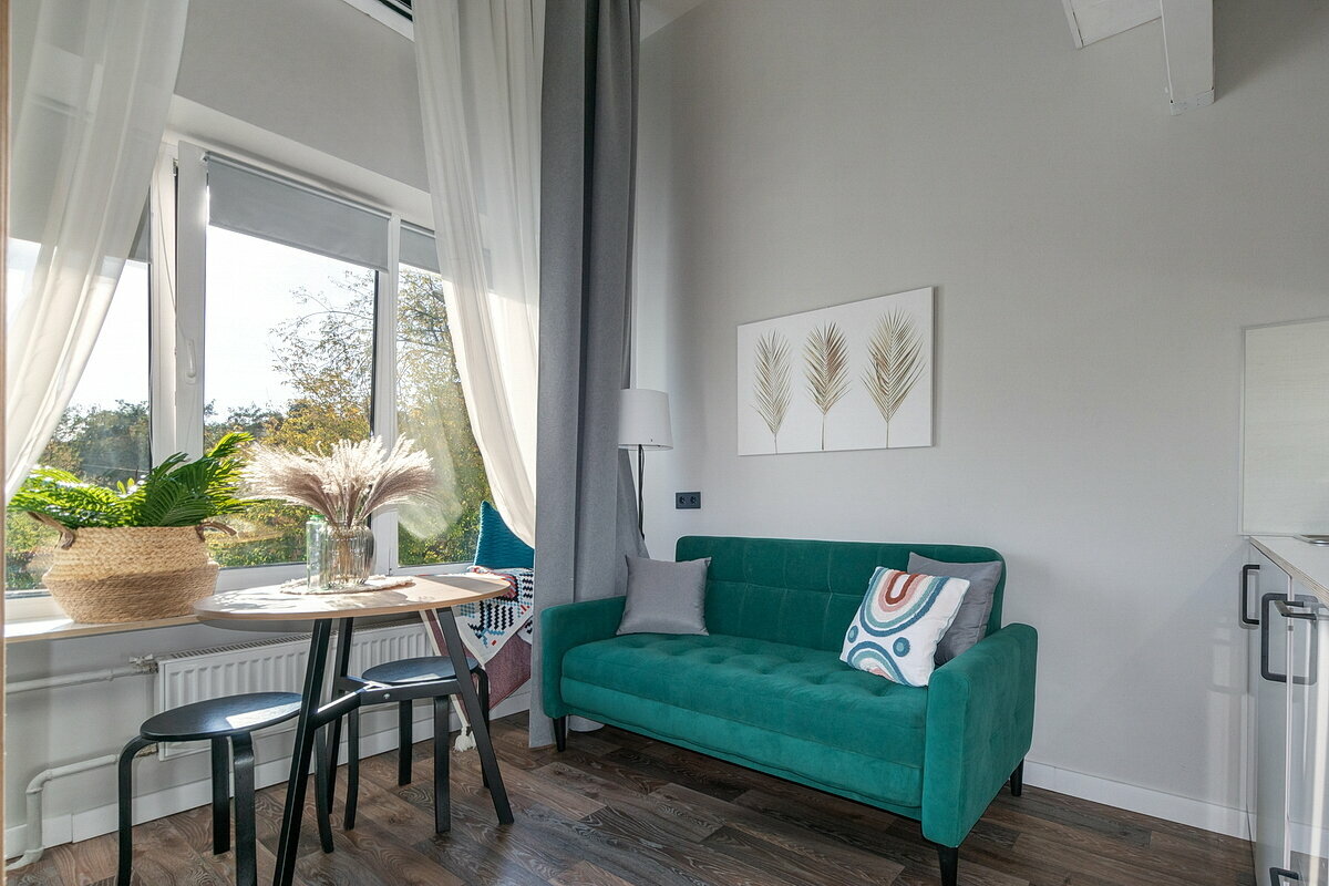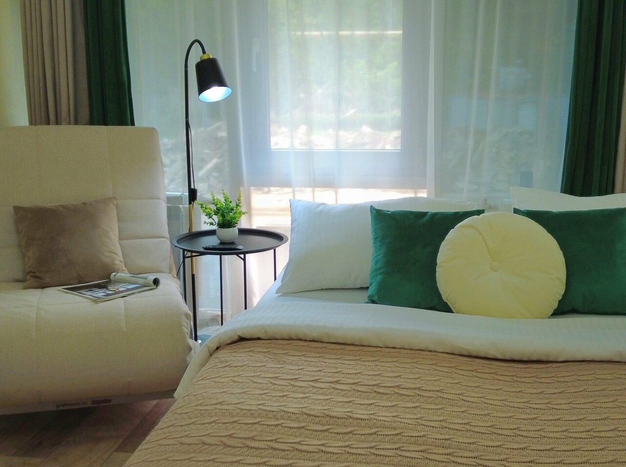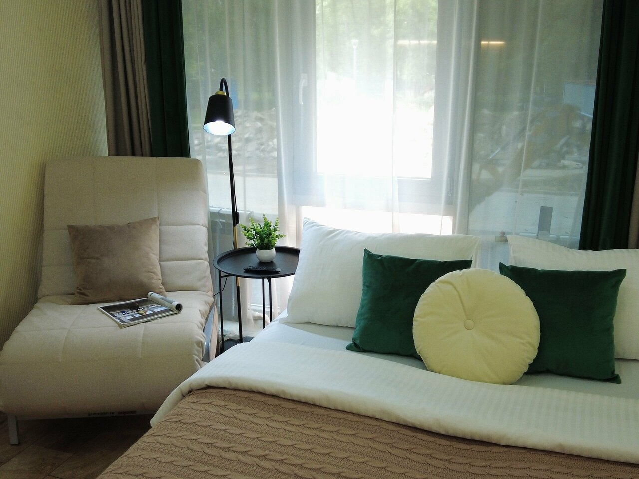 Отличные апартаменты. Рекомендую! Стильно, чисто, есть все необходимое и даже чуть больше. Постельное белье идеальное, глаженное. Хорошее расположение. В 4 минутах автобусная остановка, магазины, кинотеатр. Чтобы попить кофе даже из подъезда выходить не надо. Своя парковка для авто. Все понравилось!