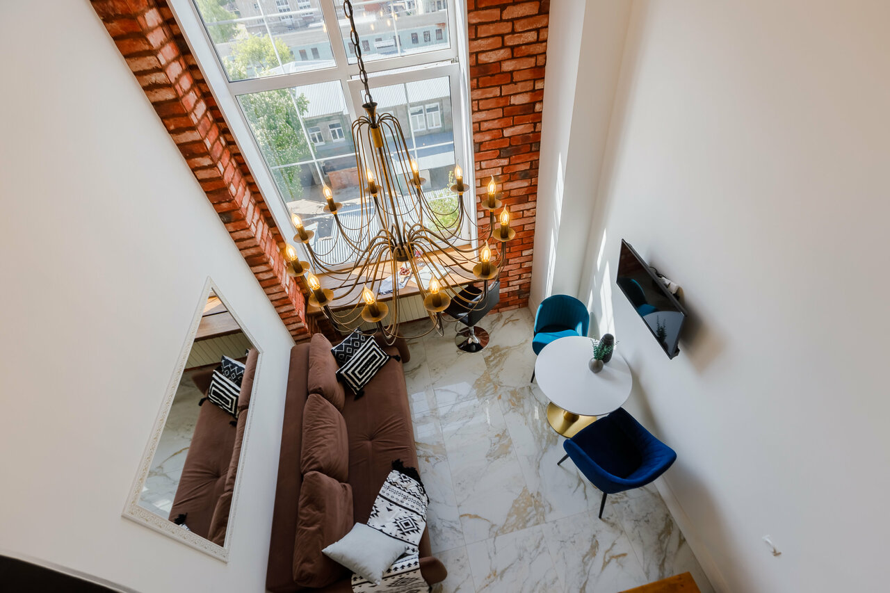 Двухуровневый апартамент Скай с дизайнерским ремонтом.Подходит для семейного отдыха, а так же для командировки. Прекрасный интерьер, сервис и чистота. Полностью оборудованы всем необходимым: техника, посуда, постельные принадлежности, полотенц...