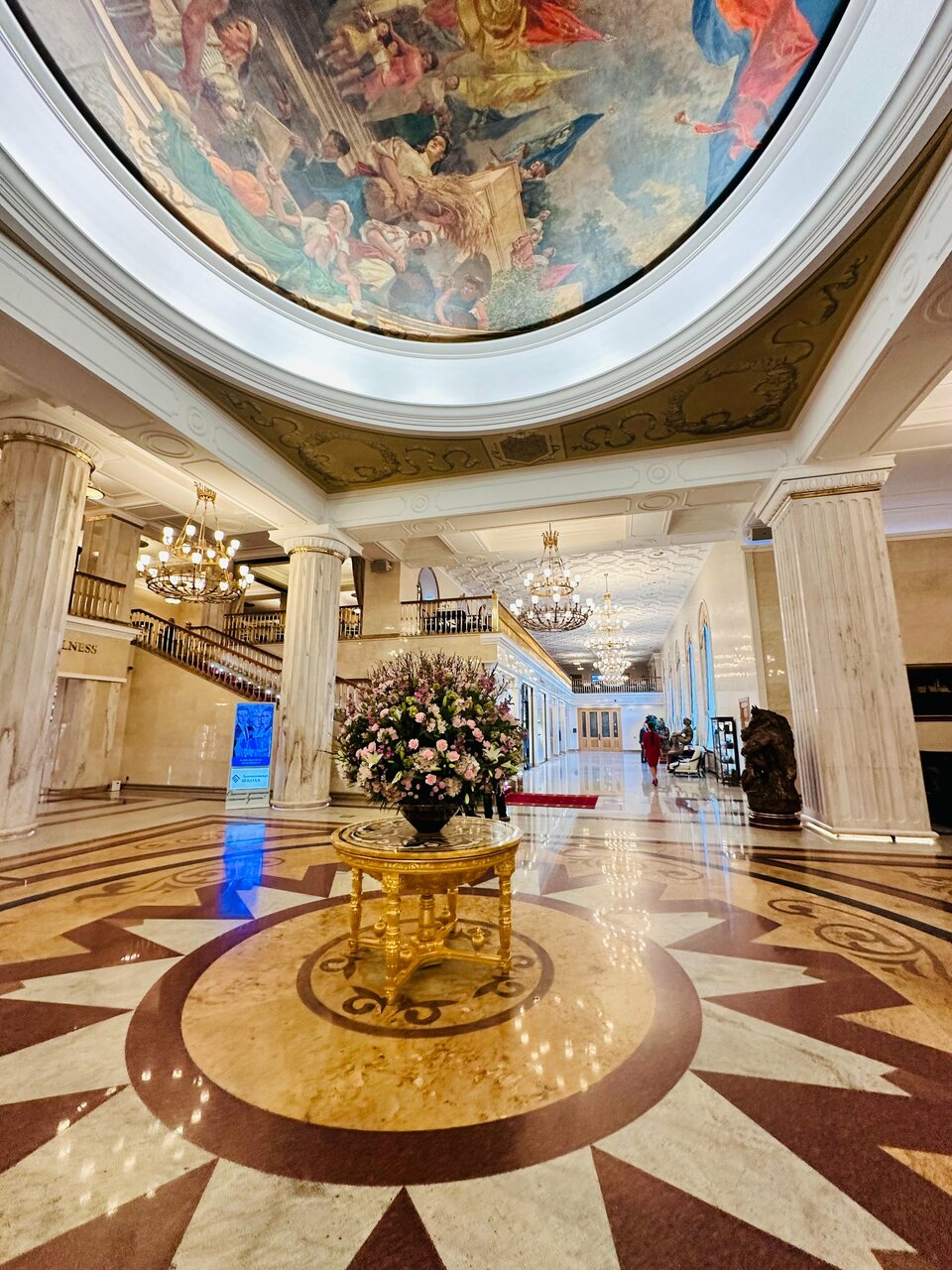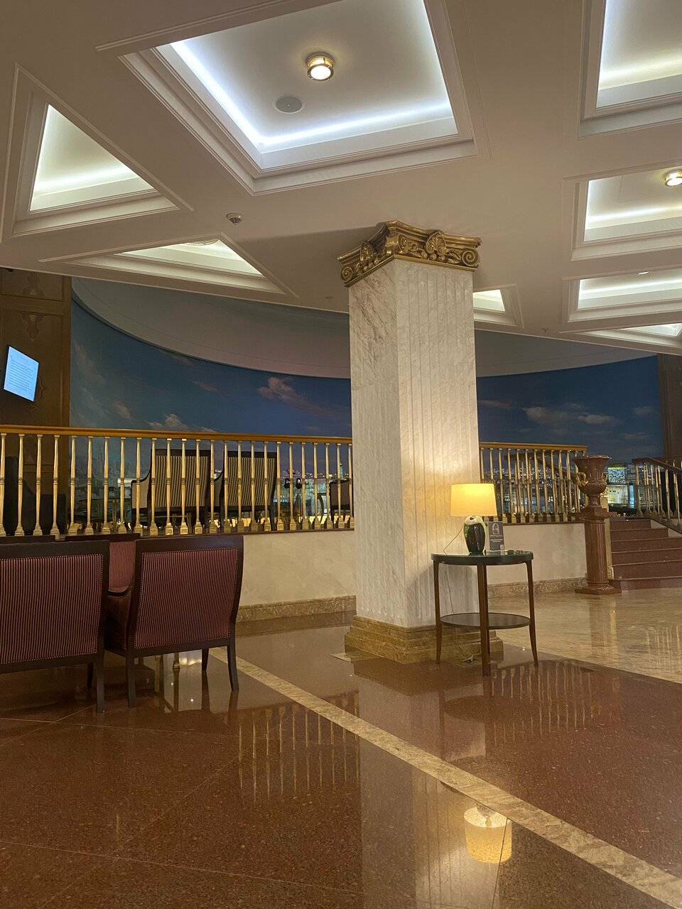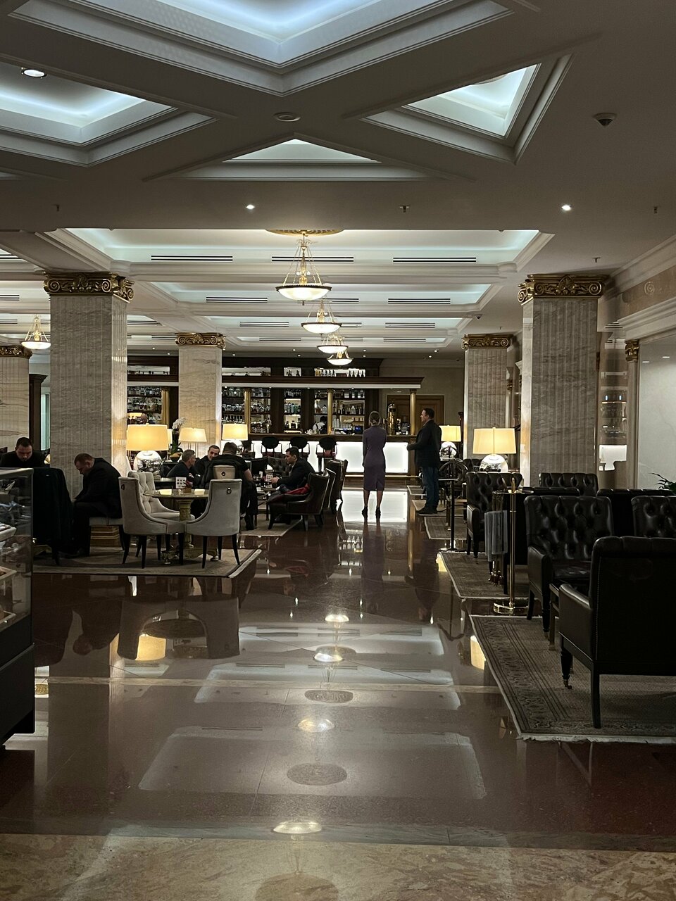 Великолепный отель с потрясающими интерьерами эпохи развитого социализма! Центр столицы! Прекрасная кухня! На самых верхних этажах панорамный бал, прямо у звезд кальянная, хотя ошибаюсь, под звездами столик на двоих — жутко романтично!