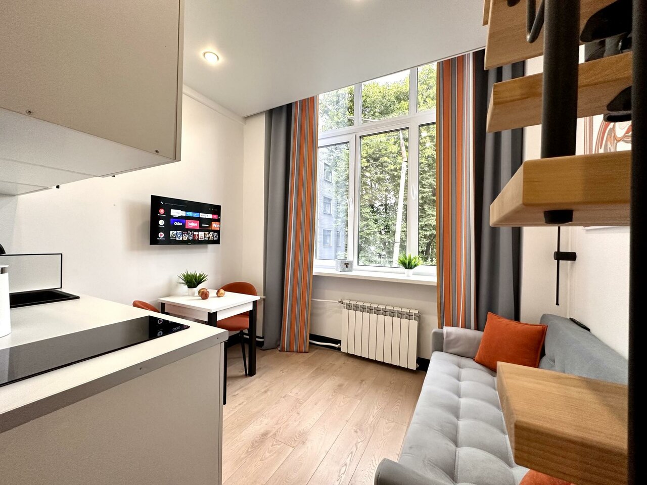 День добрый . Хорошие апартаменты . + : - метро в шаговой доступности - круглосуточный магазин - все новое , свежее - чистота и внимание от персонала — : - прохладно в номере из за большой тепло потери через огромное окно - крутая лестница - не хватало полотенца кухонного и штопора ))) Пользуйтесь инструкцией которую скидывают вам и все будет просто и понятно . Проблем в номере не было ни с чем ( ни с водой ни с техникой ) единственное подвела ручка в ванной комнате ( необходимо подтянуть крепежный винт). В остальном комфортно , уютно и по домашнему . Не хватает рядом кафе, но пользовались доставками и магазинами ( это уже к аппаратам дело не имеет , так наблюдение ) Отдыхали в номере семейный Deluxe. P.S.: Raido.Moscow. Спасибо за гостеприимство . Успехов и процветания Вам!