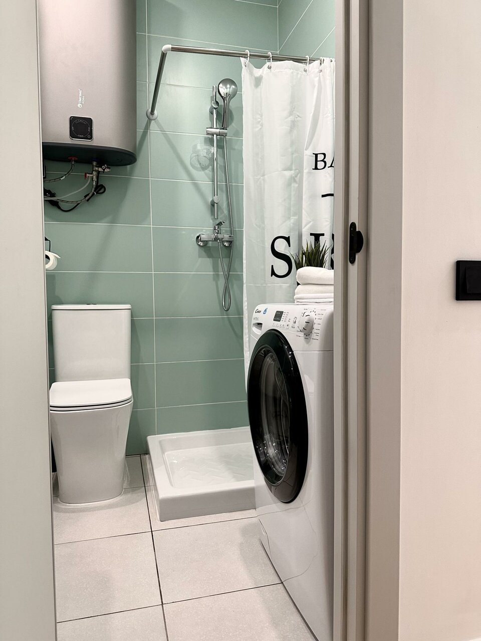 Попасть в аппартаменты тот ещё квест, китайские замки на дверях отказываются пускать) в аппартаментах чисто, есть плита, холодильник, СВЧ, стиральная машина, фен и отпариватель, все хорошо, только сан. узел мелковат, но это не критично
