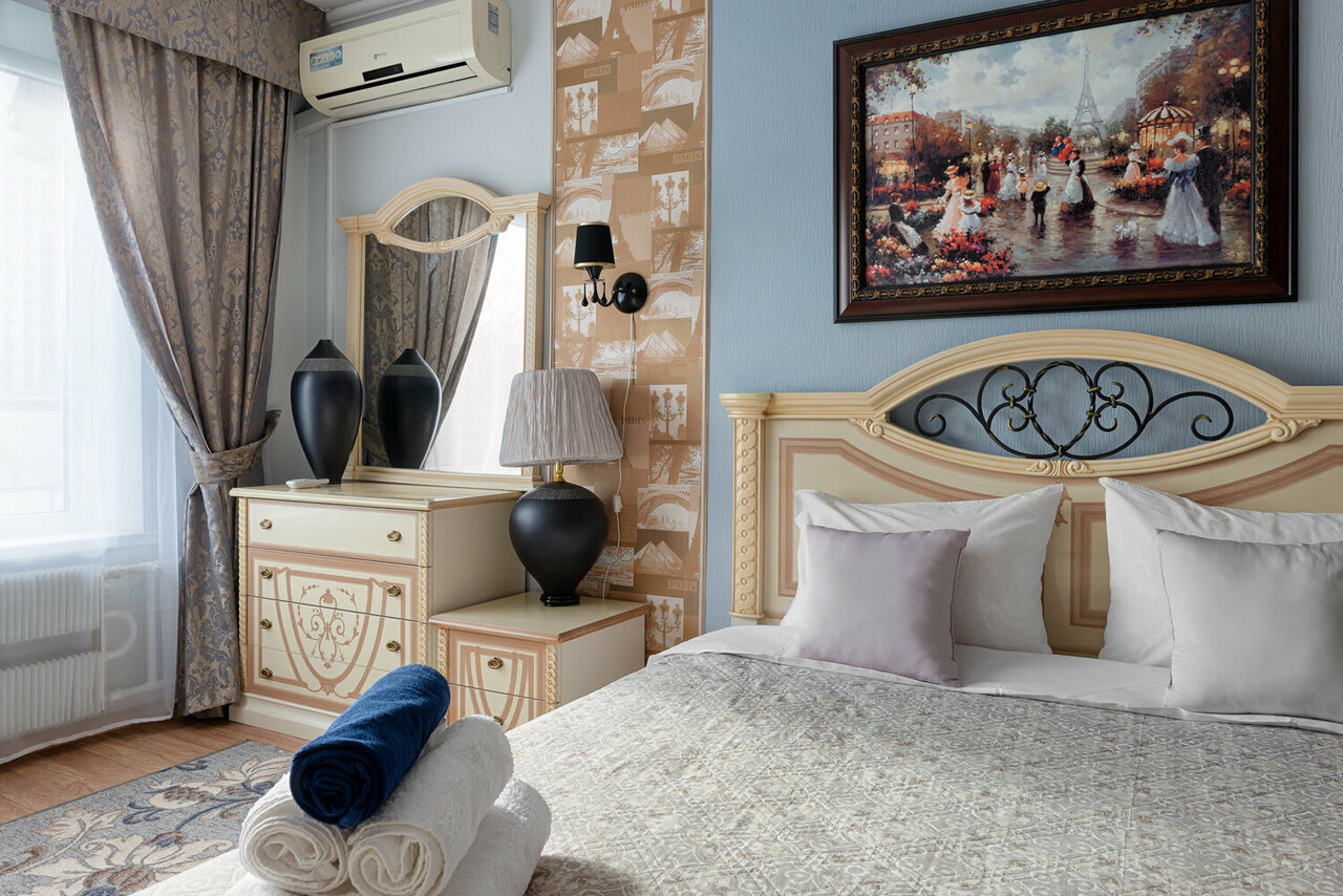 Удобства: — Номера с кондиционером, санузлом, холодильником, телевизором, Wi-Fi, кухонным уголком (плита, микроволновка, посуда, чайник). — Бесплатная парковка, лифт, ускоренная регистрация. — Дополнительно: фен, тапочки, утюг, стиральная машина, чай/кофе в номере.