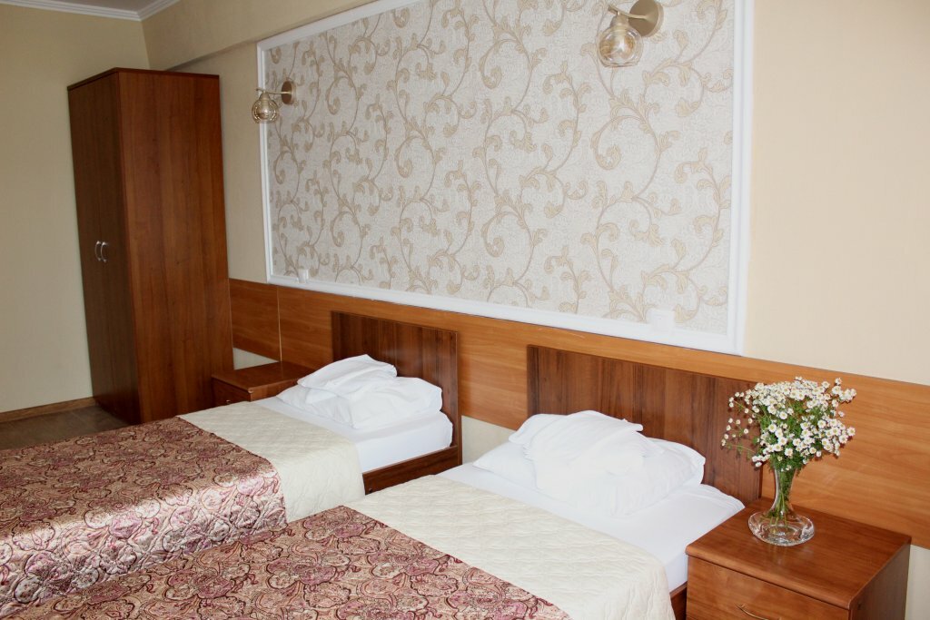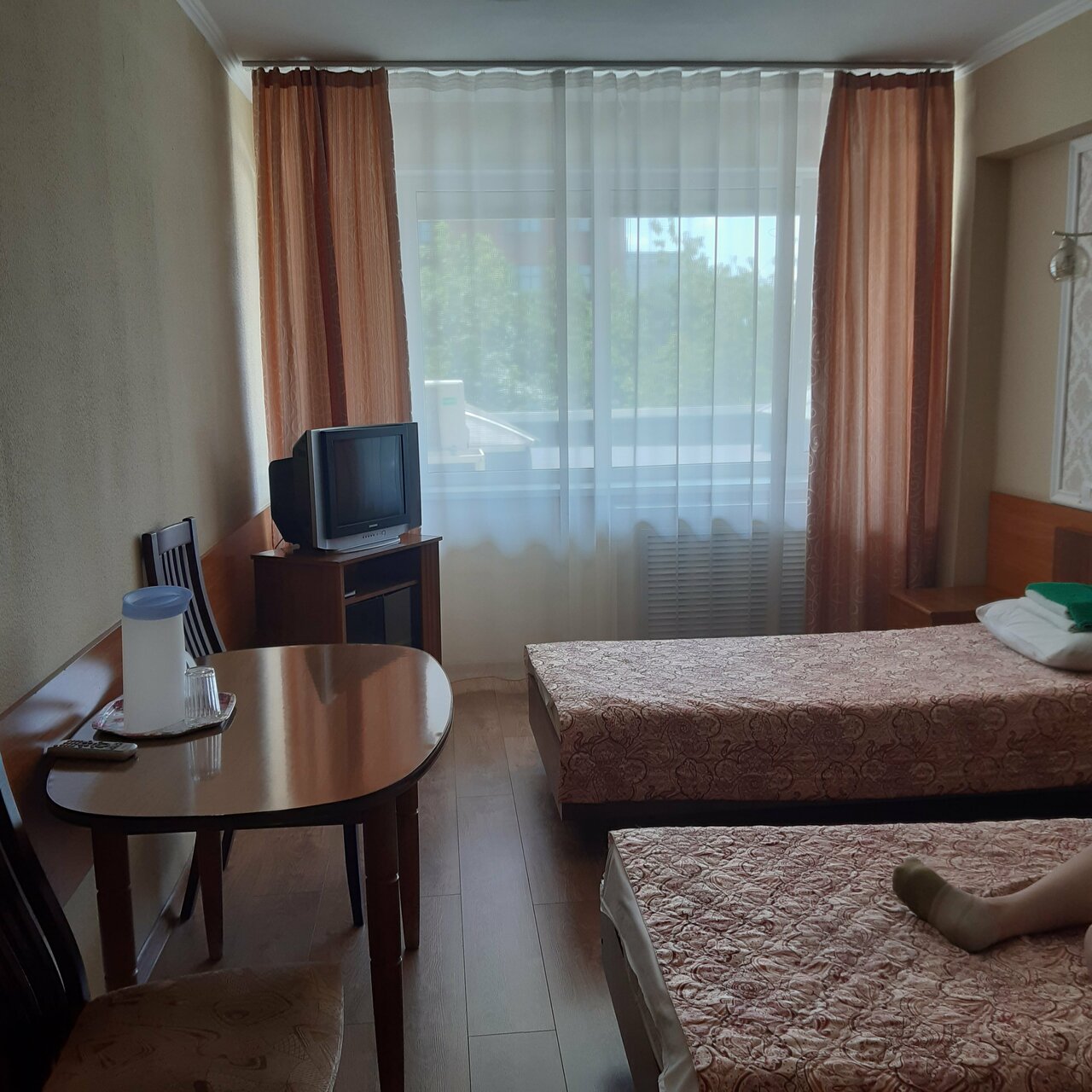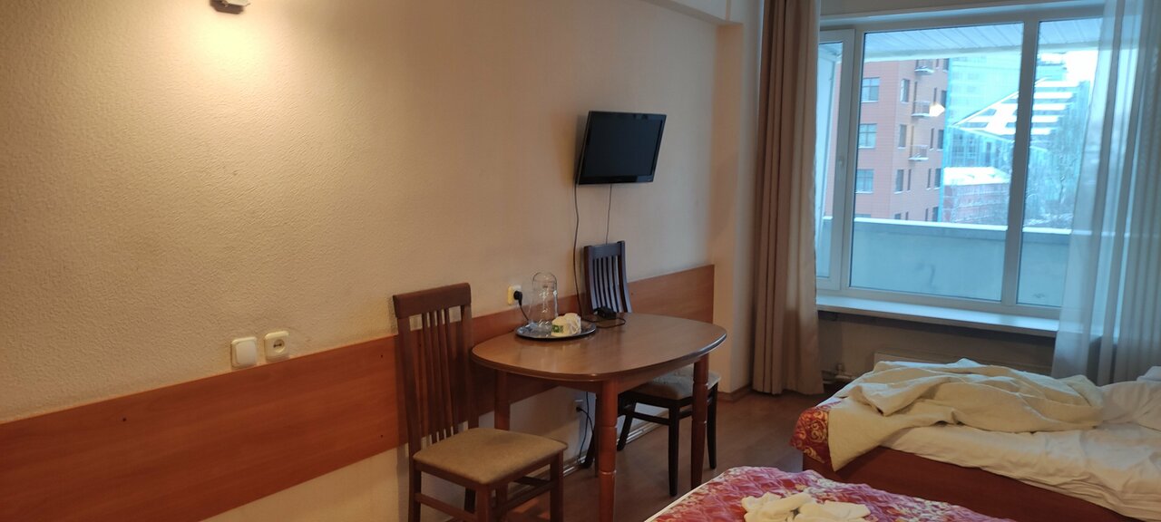 Просторный двух местный номер. Две двуспальной кровати, балкон, широкое окно. Нет электро приборов (чайник, плиточка), хотя может это и нормально, исходя из пожарной безопасности. В коридоре есть кулер с горячей водой и микроволновка.