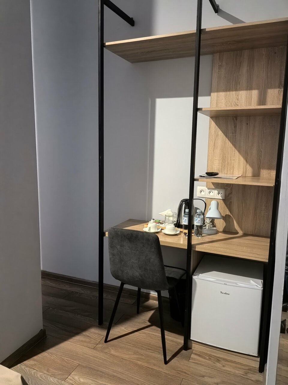 Маленькие уютные номера. Чайник в номере, холодильник. Очень для нас окозалось далеко метро,пешком 20 минут. Рядом много ресторанчиков. (не дешёвые) но и столовка есть до 19.00. В принципе, норм.