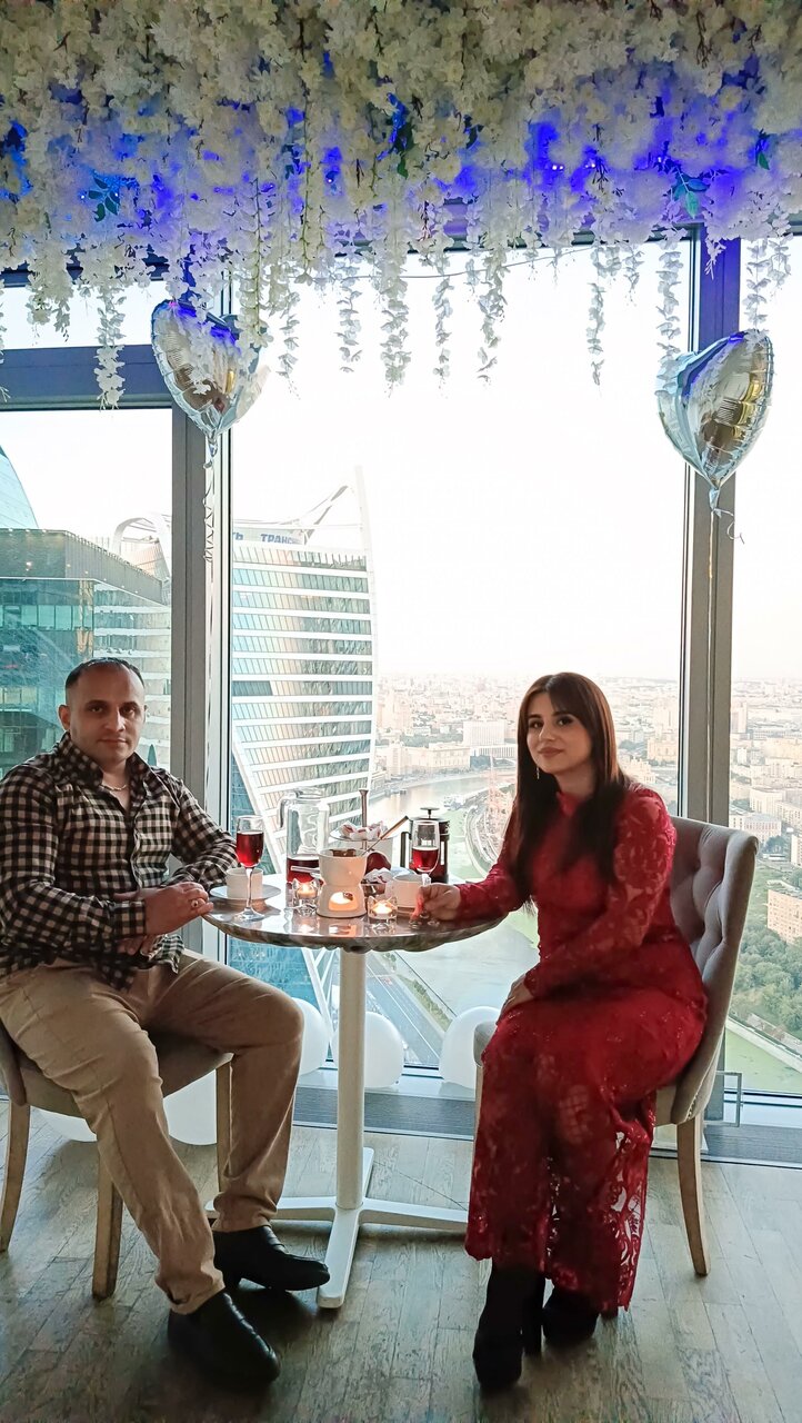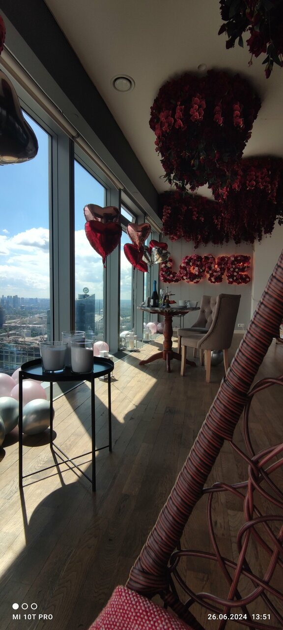 Здравствуйте. Праздновали годовщину свадьбы, очень романтическая обстановка! Вид с высоты в вечернее время прекрасный. Персонал вежлевый и внимательный, не надоедал визитыми, давая насладится прекрасными моментами. Романтический столик (шампанское, фрукты, конфеты) изумительный. После фотосъёмка фото шикарные. Нам всё понравилось. Планируем посетить ещё раз, только этаж выше будет )))