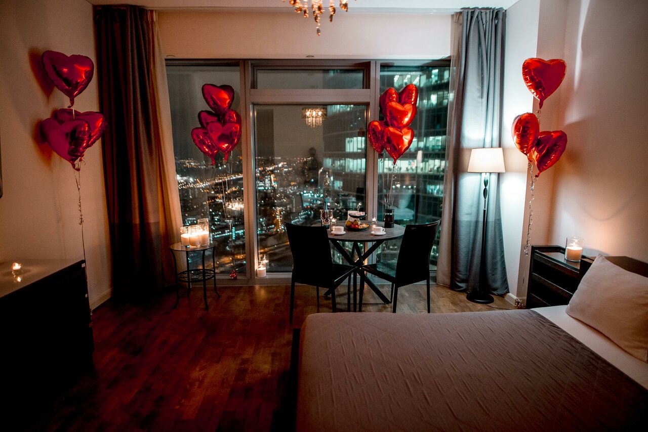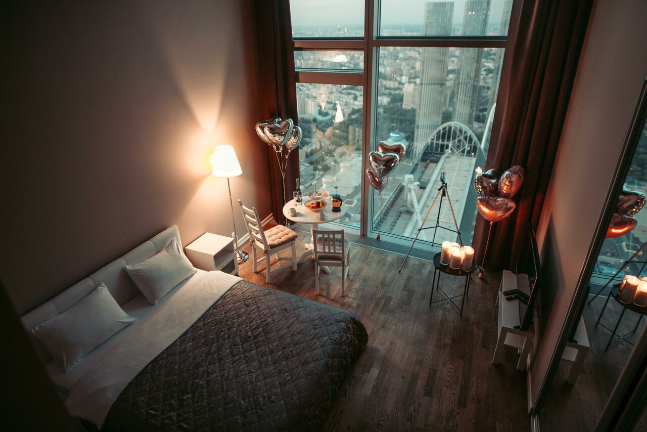 Романтический номер STANDARD на 51 этаже с видом на самый центр города и рассвет. В стоимость входит фруктовая тарелка, напитки, рафаэлло и фотосессия 15 минут с красивым видом. Можно забронировать на 2, 4, 6, 12 часов и сутки.