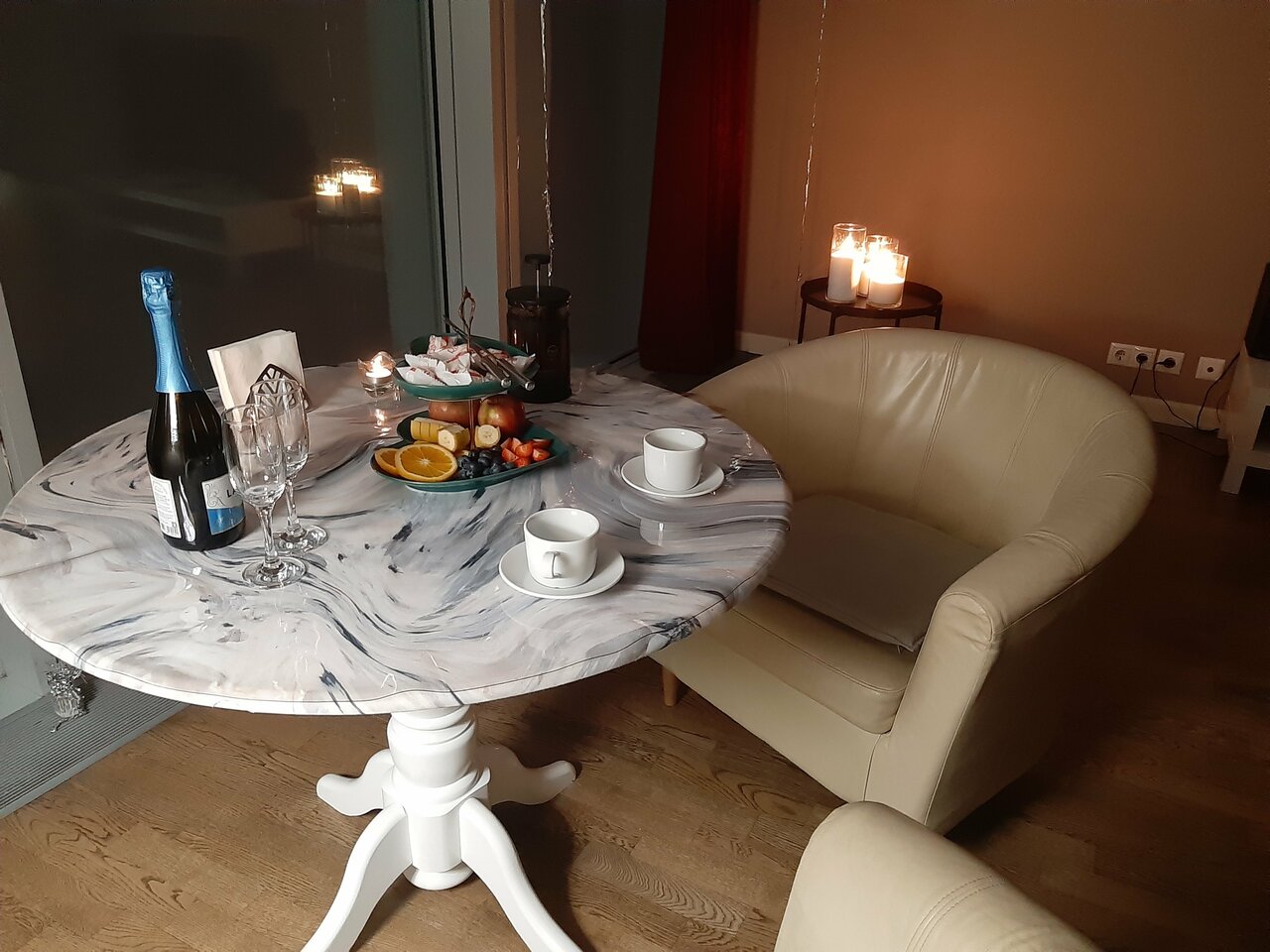 - Изумительный романтический столик (шампанское, фрукты, конфеты)