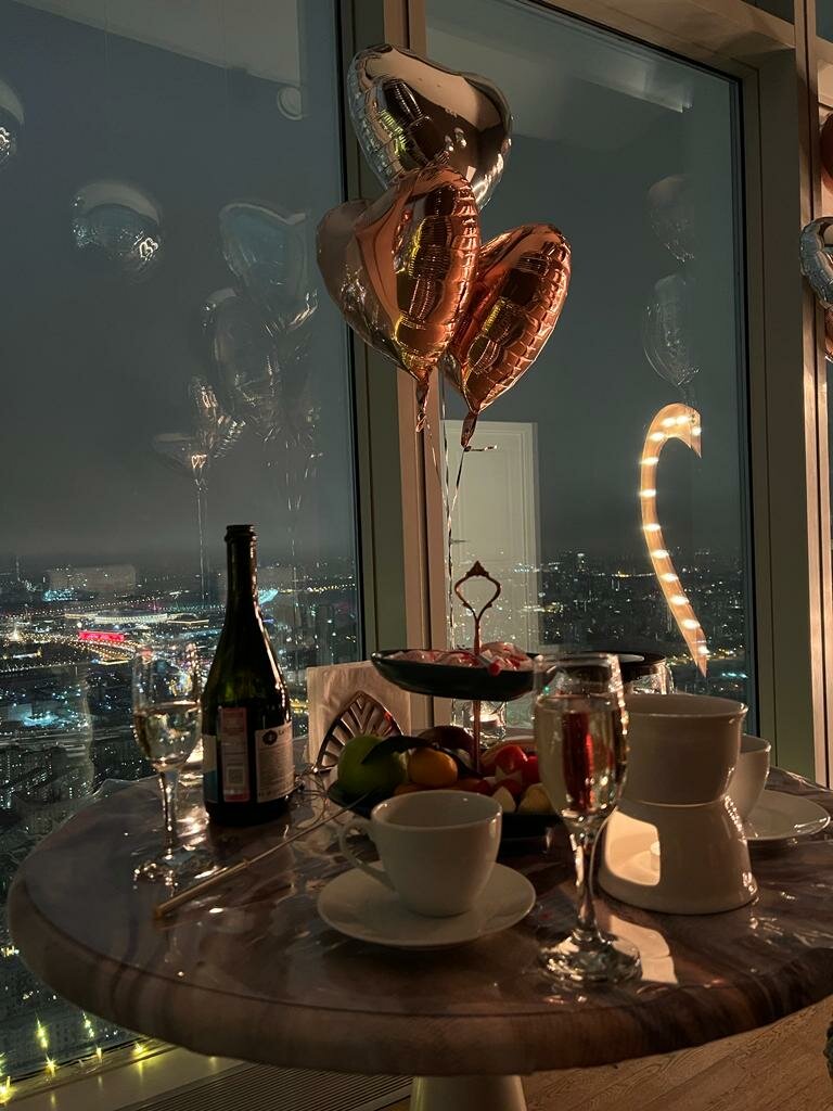 Романтический номер STANDARD на 67 этаже с видом на самый центр города и рассвет. В стоимость входит фруктовая тарелка, напитки, рафаэлло и фотосессия 15 минут с красивым видом. Можно забронировать на 2, 4, 6, 12 часов и сутки.