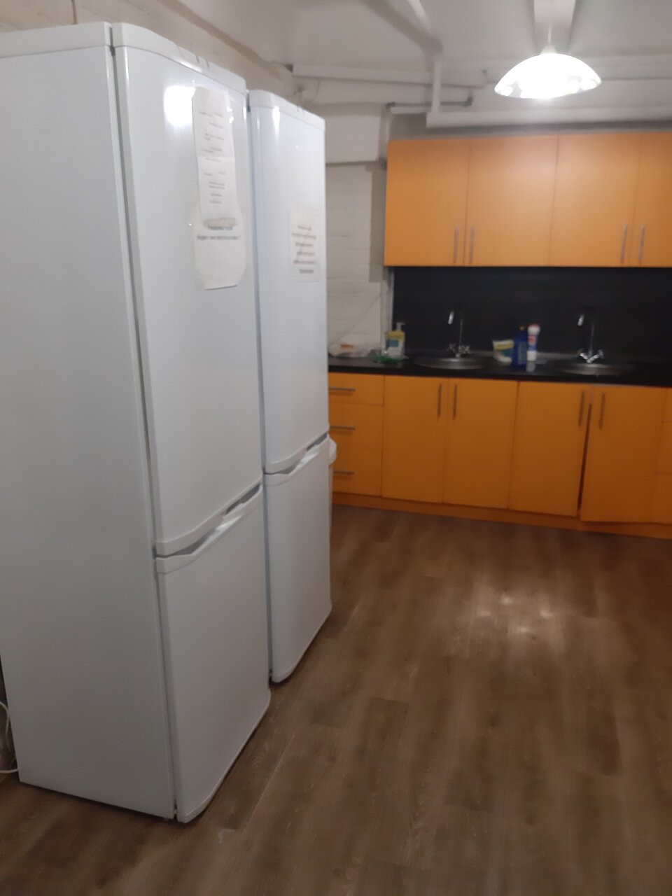Горячей воды не бывает, кухня одна на четыре этажа. Продукты хронить только на кухне.