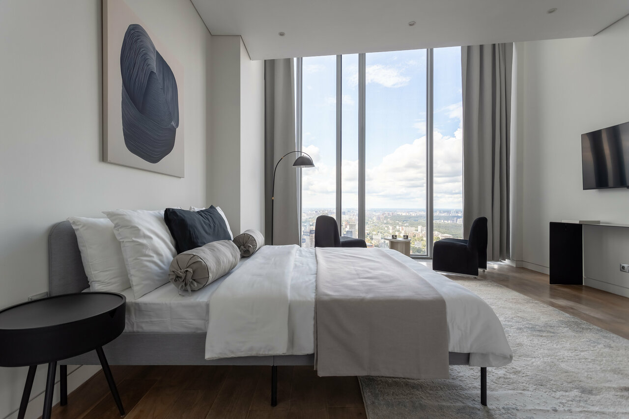 В апартаментах STUDIO одна большая двуспальная кровать и диван-кровать, что позволяет с удобством расположиться 1-4-м гостям. Из панорамных окон открывается вид на город.