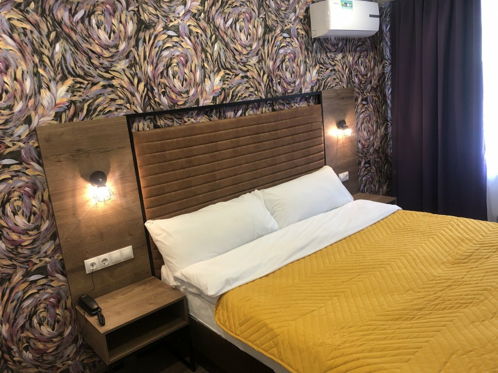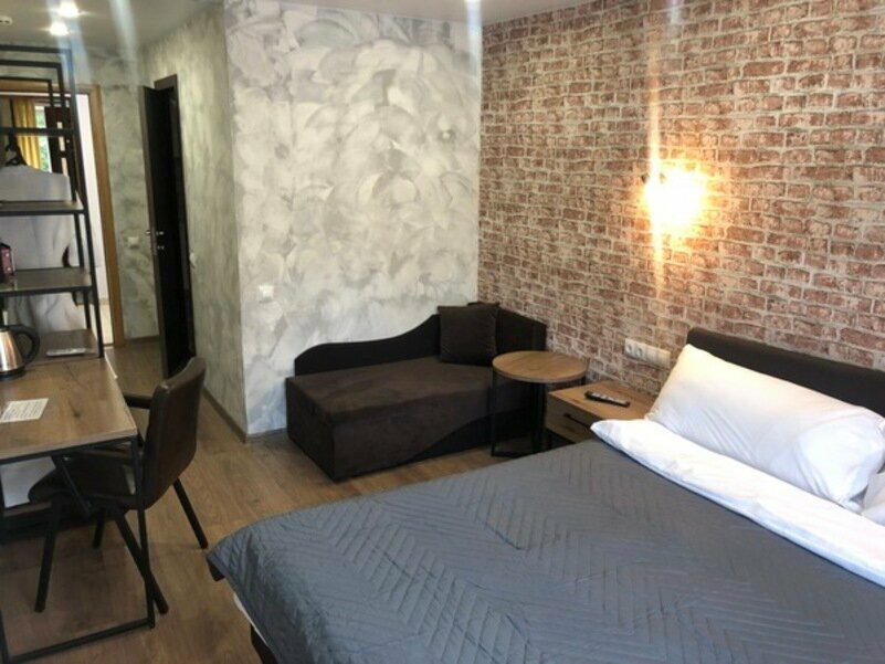 Однокомнатный номер Комфорт с двуспальной кроватью, оформлен в стиле лофт и оснащен всем необходимым для комфортного проживания 1-3 гостей от зоны отдыха с Wi-Fi и ЖК ТВ с диагональю более 32' до собственная просторная ванная комната.