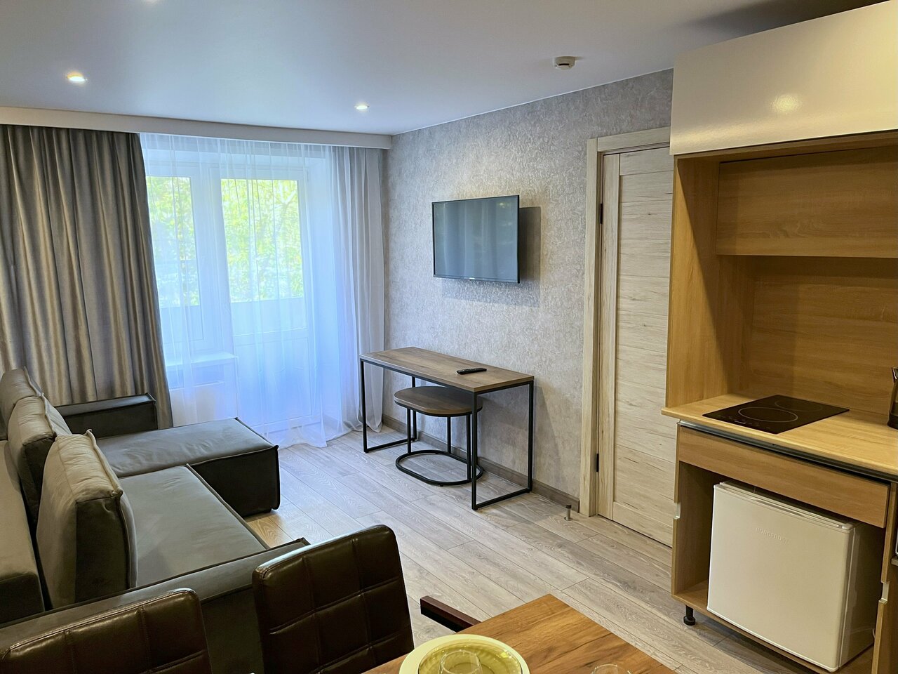 Апартаменты состоят из двух комнат - просторной гостиной и спальни. В гостиной имеется кухонная зона с микроволновой печью, электрической плитой и холодильником.