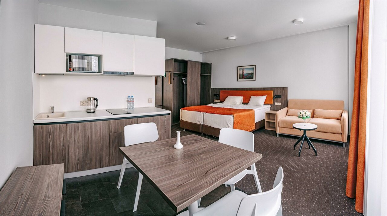 Бронировала студию с кухней, заселили в номер без кухни (выбирала именно с кухней) , разницу в цене не вернули. В номере были только маленькие полотенца, пришлось просить большие. В целом отель отличный, удобная парковка, чисто, но осадочек остался