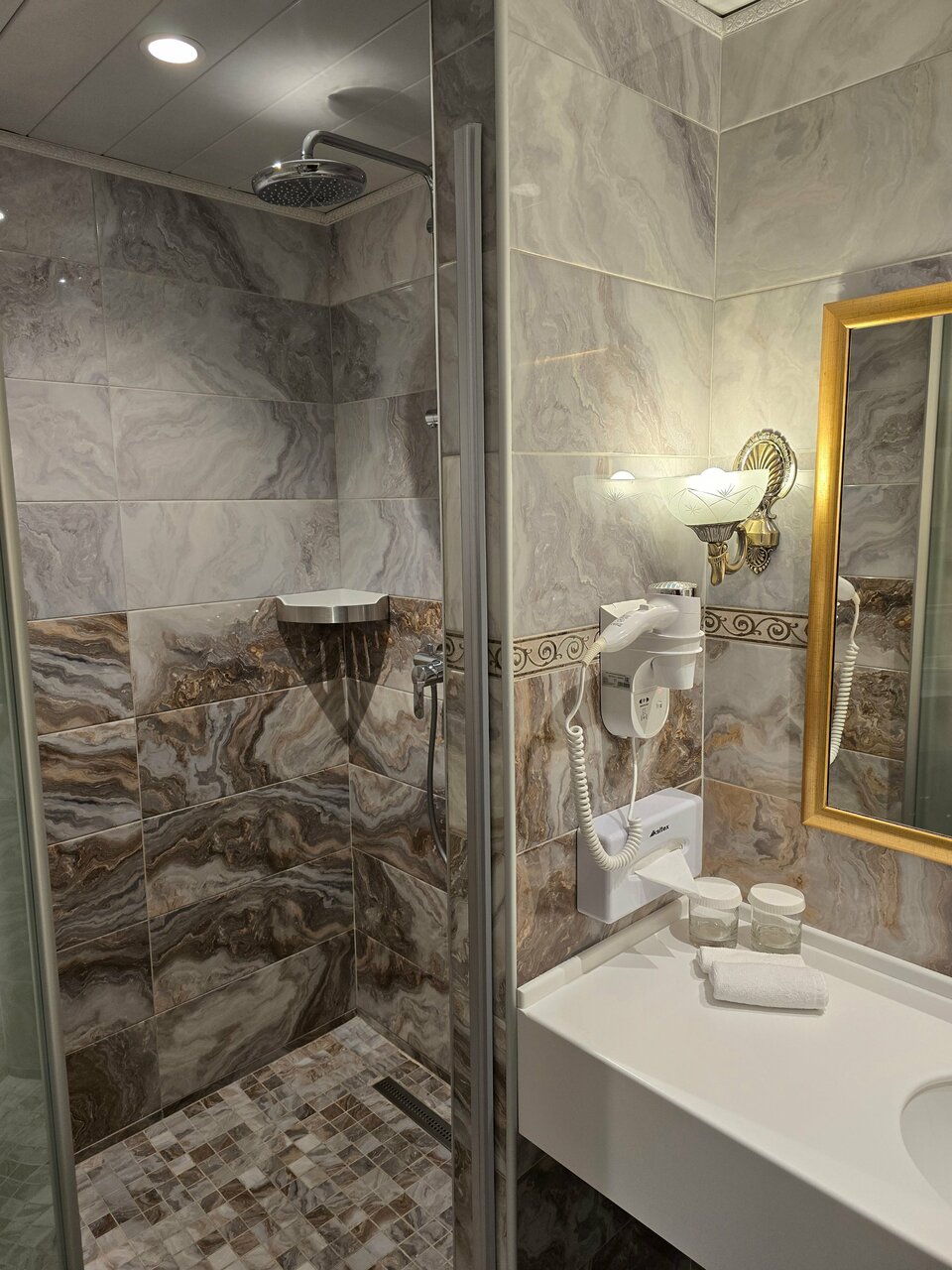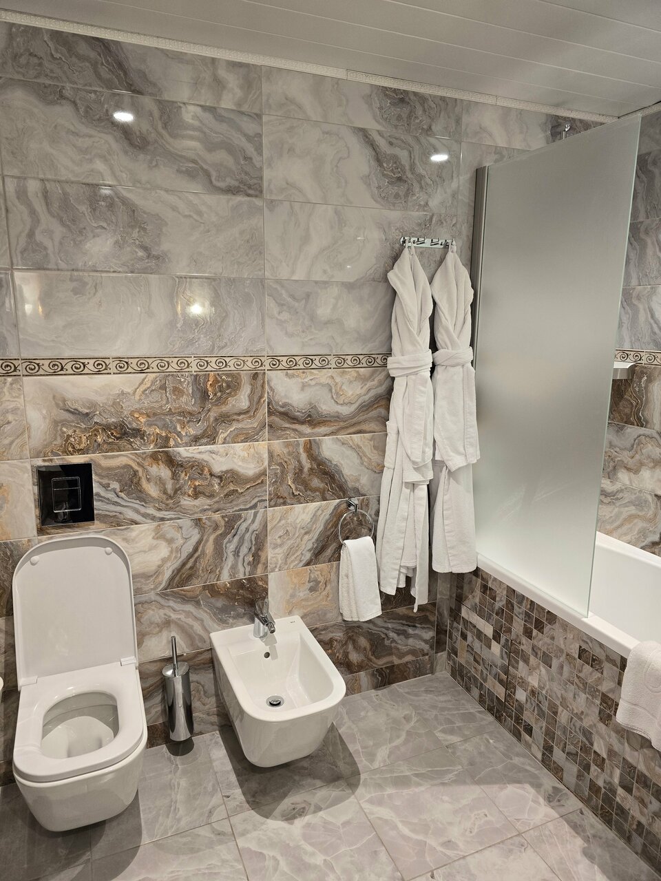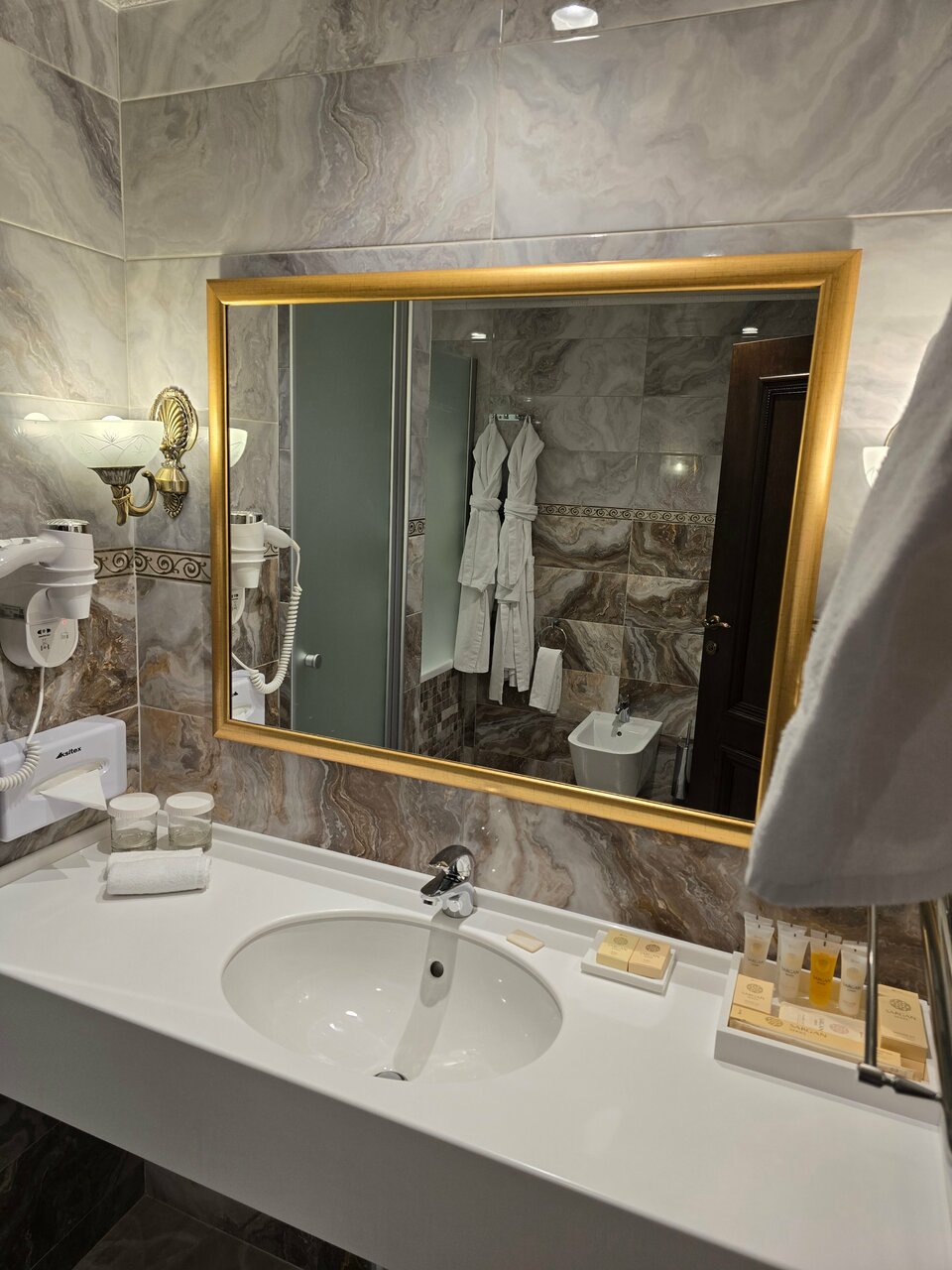 Номер был отличный. Но заселили и не уведомили о ремонтных работах тут же на этаже. понадобилось два дня звонков на ресепшен, чтобы их остановить на время проживания. Уборка отличная, все было в достатке и шампуни и халаты. Телевизоры супер, мебель хорошая. Но завтраки мне в отеле не нравятся — он один для всех корпусов