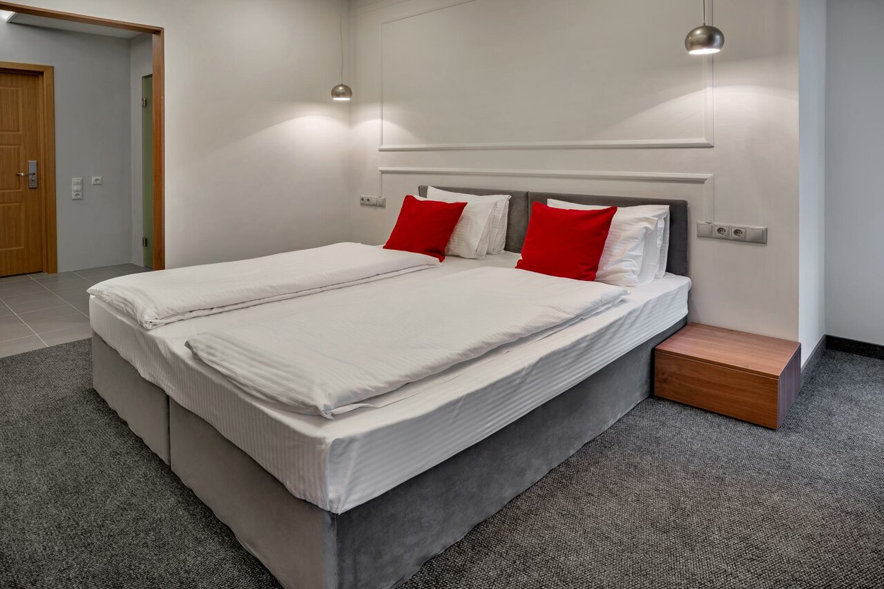 Двухместный номер с широкой кроватью и новым матрацем. В номере имеется телевизор, мини-холодильник, чайник, чайный-набор. Собственная большая ванная комната. Завтрак предоставляется бесплатно. Бронируйте по телефону будут скидки.
