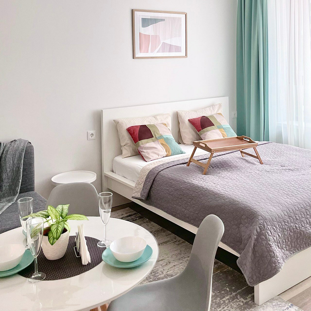 Просторная студия с двуспальной кроватью и раскладным диваном. Подходит для проживания 3 человек