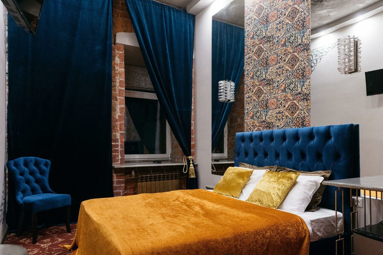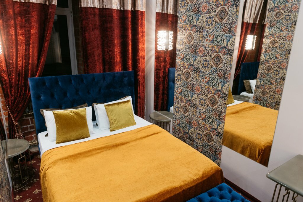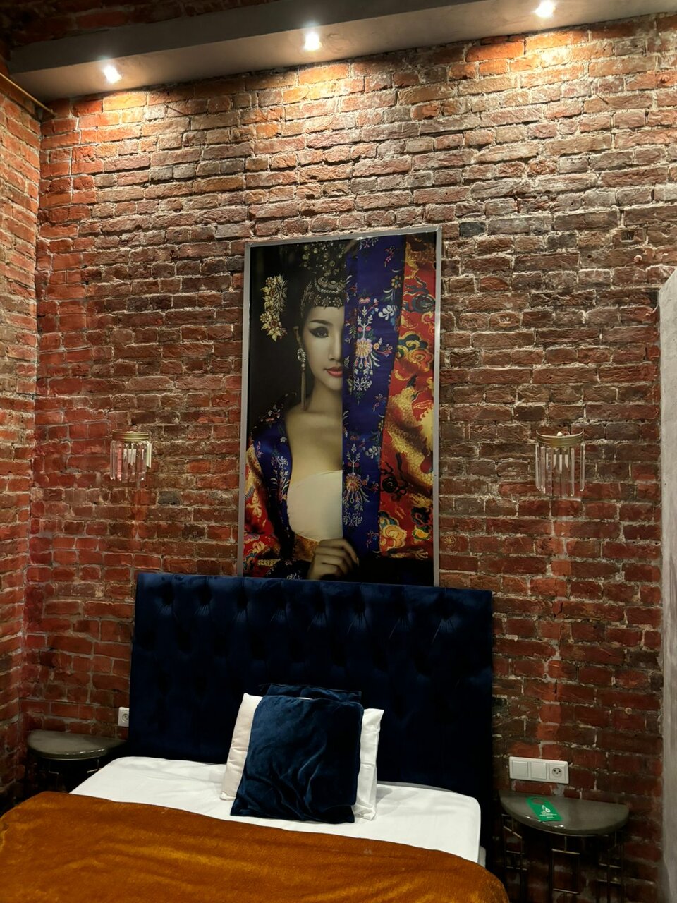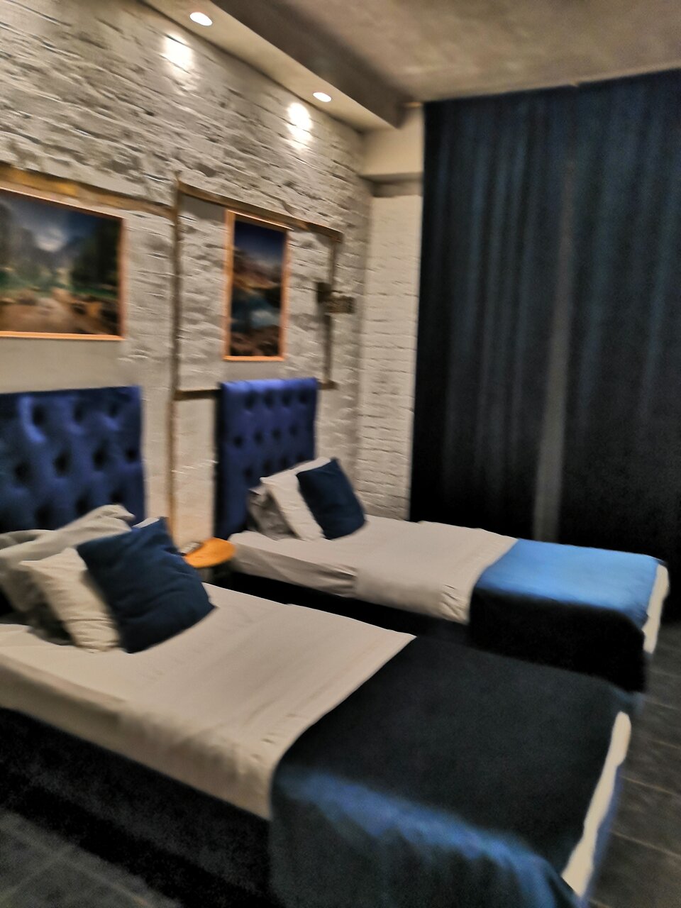 Большой минус в двух номерах пахнет тиной(канализацией), номер мрачный, с дизайнерской безвкусицей, коричневые подушки, жёлтое покрывало, фиолетовые шторы, красный ковролин, серые стены, шкафчики как на заводе в раздевалке, бредовые узоры на стенах и потолке. Цветные, годами не стиранные пуфики кладут на подушки для сна. Мерзковата обстановка.