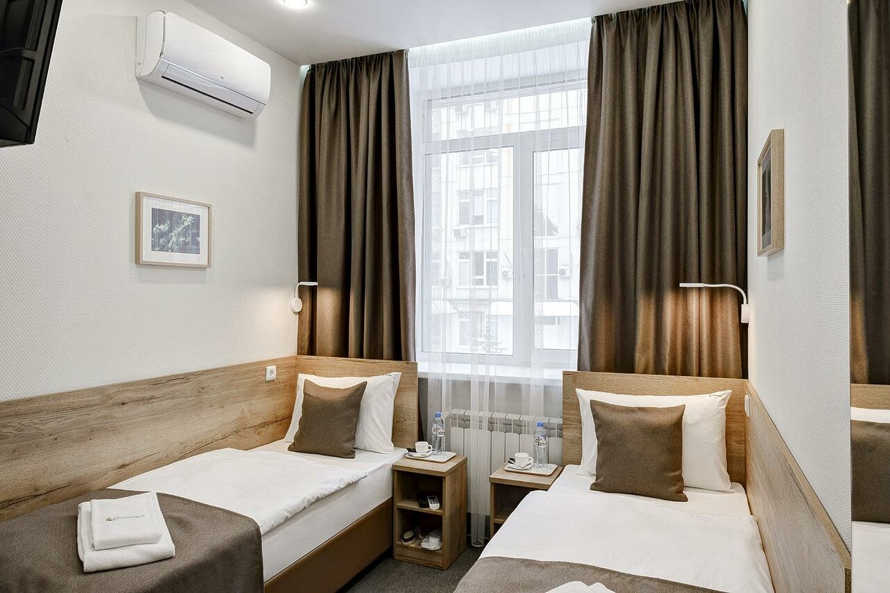 Чистый, уютный отель. Номера прям как на фото. В целом нам очень понравилось! Стильно. Каждый день в номере моют, убирают, много персонала. Про тишину в номерах писали правду, разговоры соседей можно слышать, но только громкие, и это особо не мешает, если сами смотрите телевизор например. Из минусов: Стандарт обычно побольше.. тут в номере особо не разбежаться, конечно, но от этого он ещё более уютный. Вода горячая и холодная в автомате, который один на весь этаж, и нам приходилось с каждой чашкой ходить в другой конец коридора, что изрядно выматывает! В цоколе есть кафе, предлагают еду в номер по довольно низким ценам (например пицца 450 руб), попробовали — очень -очень вкусно! Обязательно заходите покушать туда!