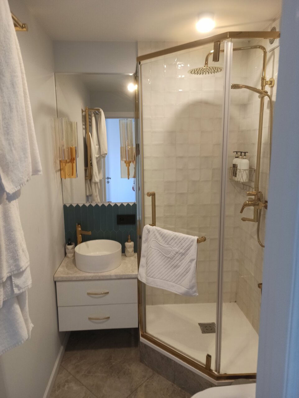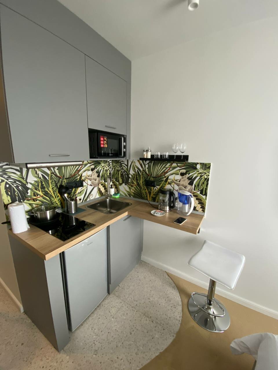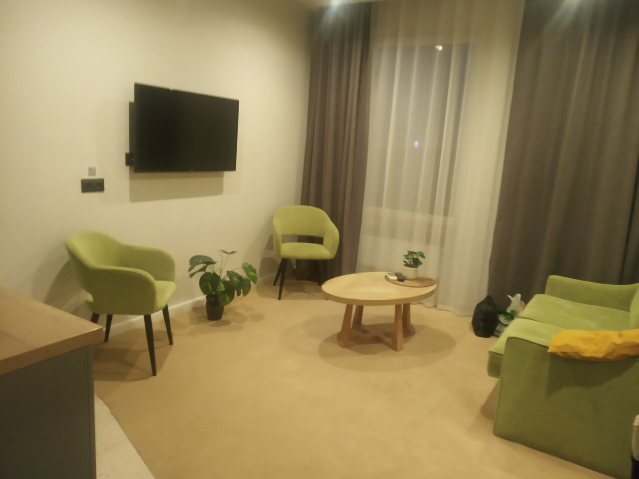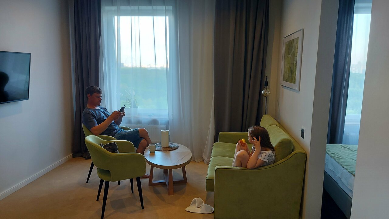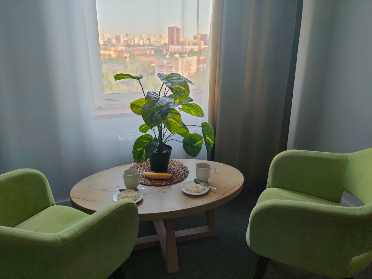 Восхитительное место для командировки и отдыха! Комфортно, уютно, как дома. Хорошая шумоизоляция, приятный и ненавящевый клиентский сервис, номер оборудован всем необходимым для комфортного проживания: кухня с варочной панелью, посудой, чайником, микроволновкой, холодильником, морозильной камерой, средством для мытья посуды и даже фильтром-кувшином для воды! В ванной комнате — электрический полотенцесушитель, шампунь, кондиционер, гель для душа, лосьон для тела, всё в достаточном количестве. Также в номере — стиральная машинка, утюг и гладильная доска. Телевизор со множеством доступных популярных приложений для просмотра фильмов и ТВ-каналов. Во многих отзывах уже написано, какие магазины находятся в самом здании. Дополню, что в 10ти минутах ходьбы расположен ТЦ Парус, где можно купить всё необходимое и вкусно поесть, если нет желания готовить в номере. В общем, впечатления самые положительные! Это место, куда хочется возвращаться снова и снова)!