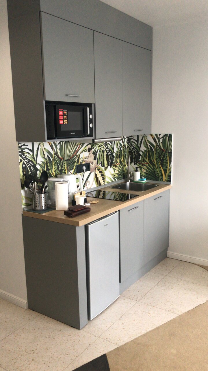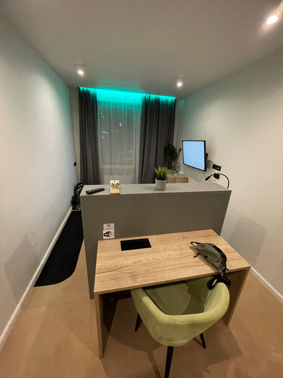 Стильный номер, практичный, много чего имеется (холодильник, микроволновка, чайник, много посуды, плита, большой телевизор, 2 стула, стол, гели, шампунь). Неподалёку метро. Из минусов, разве что, треснутое зеркало в ванне (о котором администратор сказала:’ да, я знаю, что оно треснуло’ и всё. И неприятный запах из холодильника)