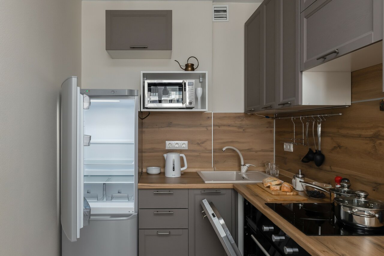 Чисто, новый современный ремонт. На кухне есть разные виды чая, кофе, вкусные печенья, бутылка воды, посуда, плита, холодильник, посудомойка. Есть интернет. Всё супер! Рекомендую!