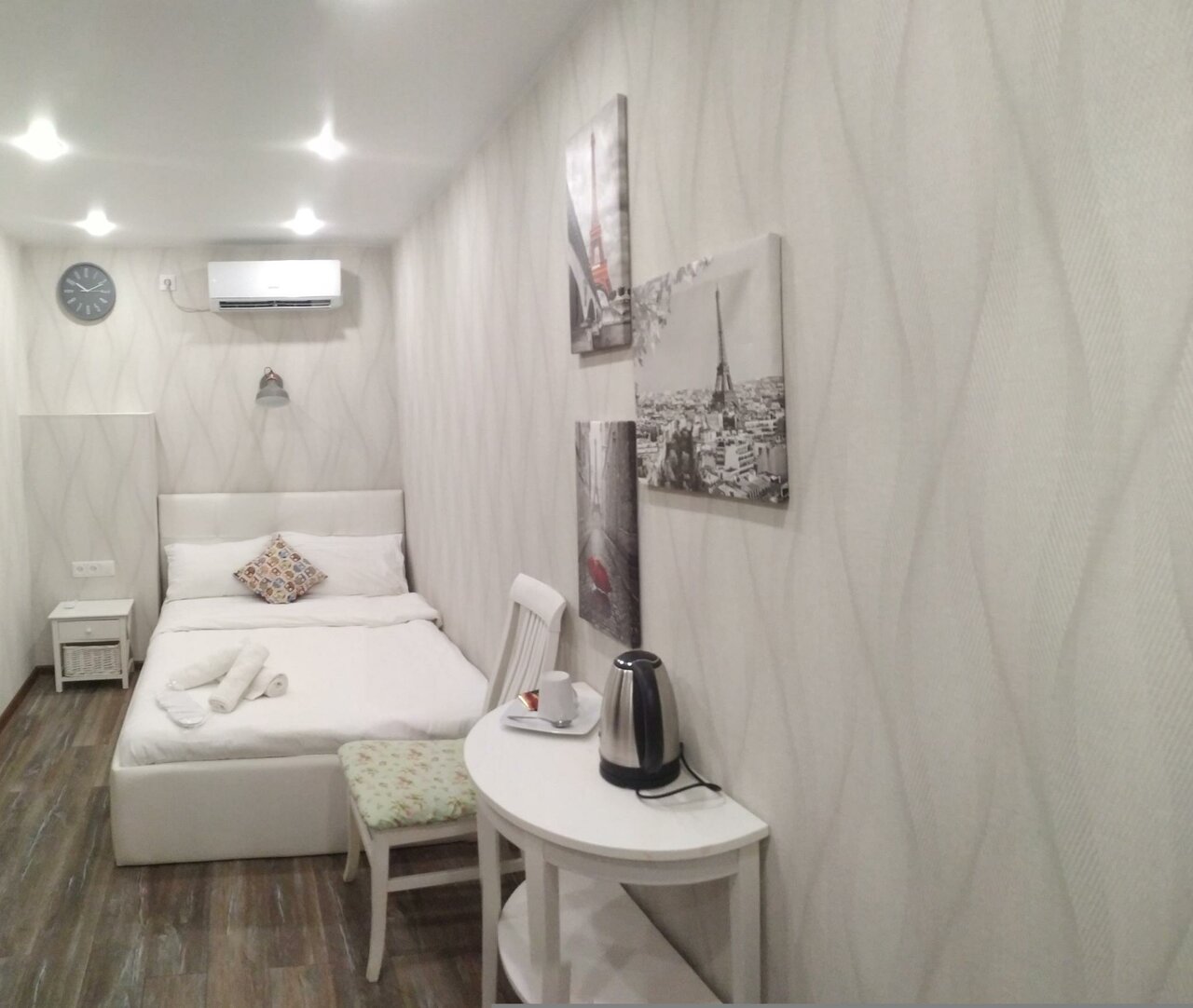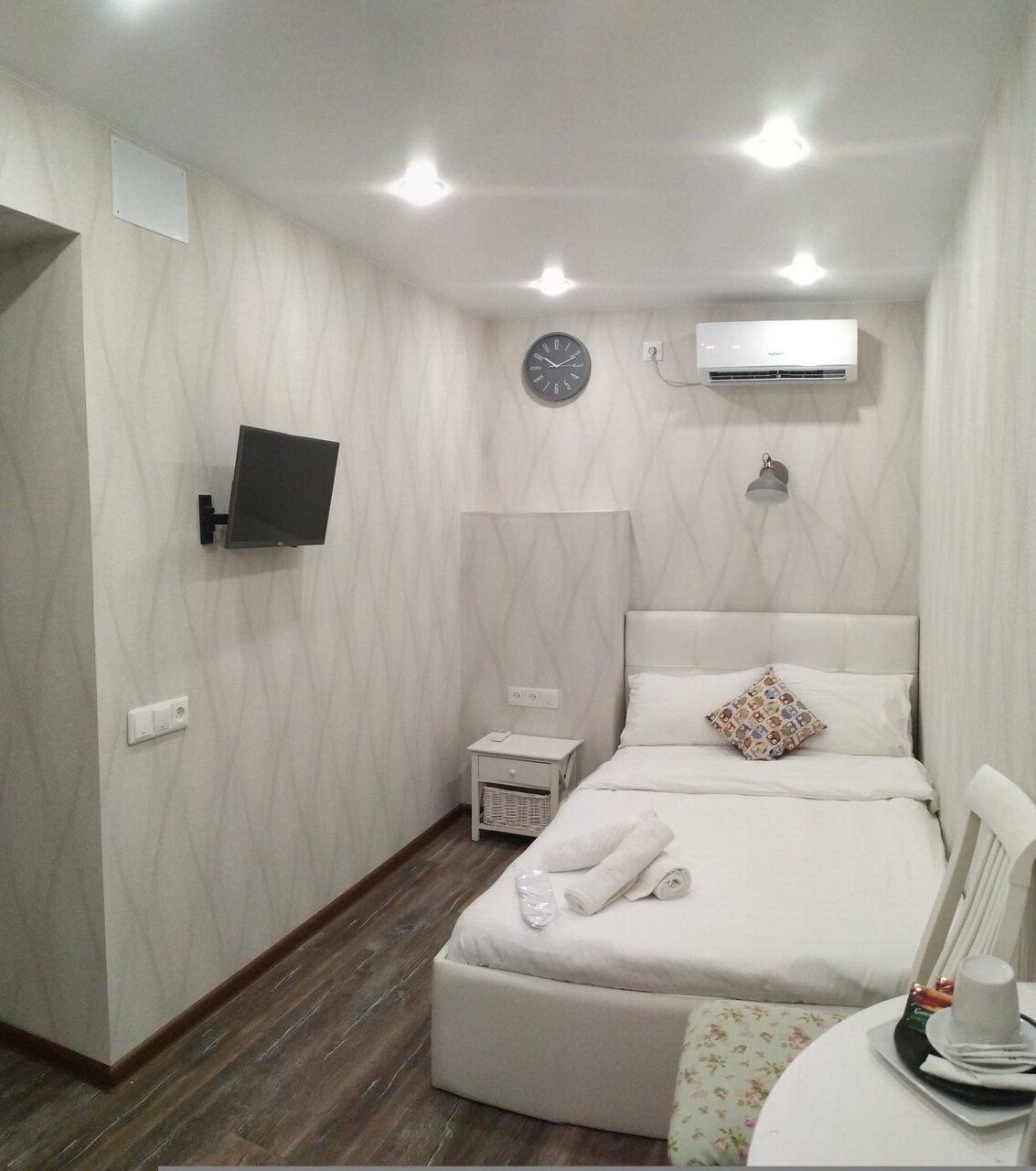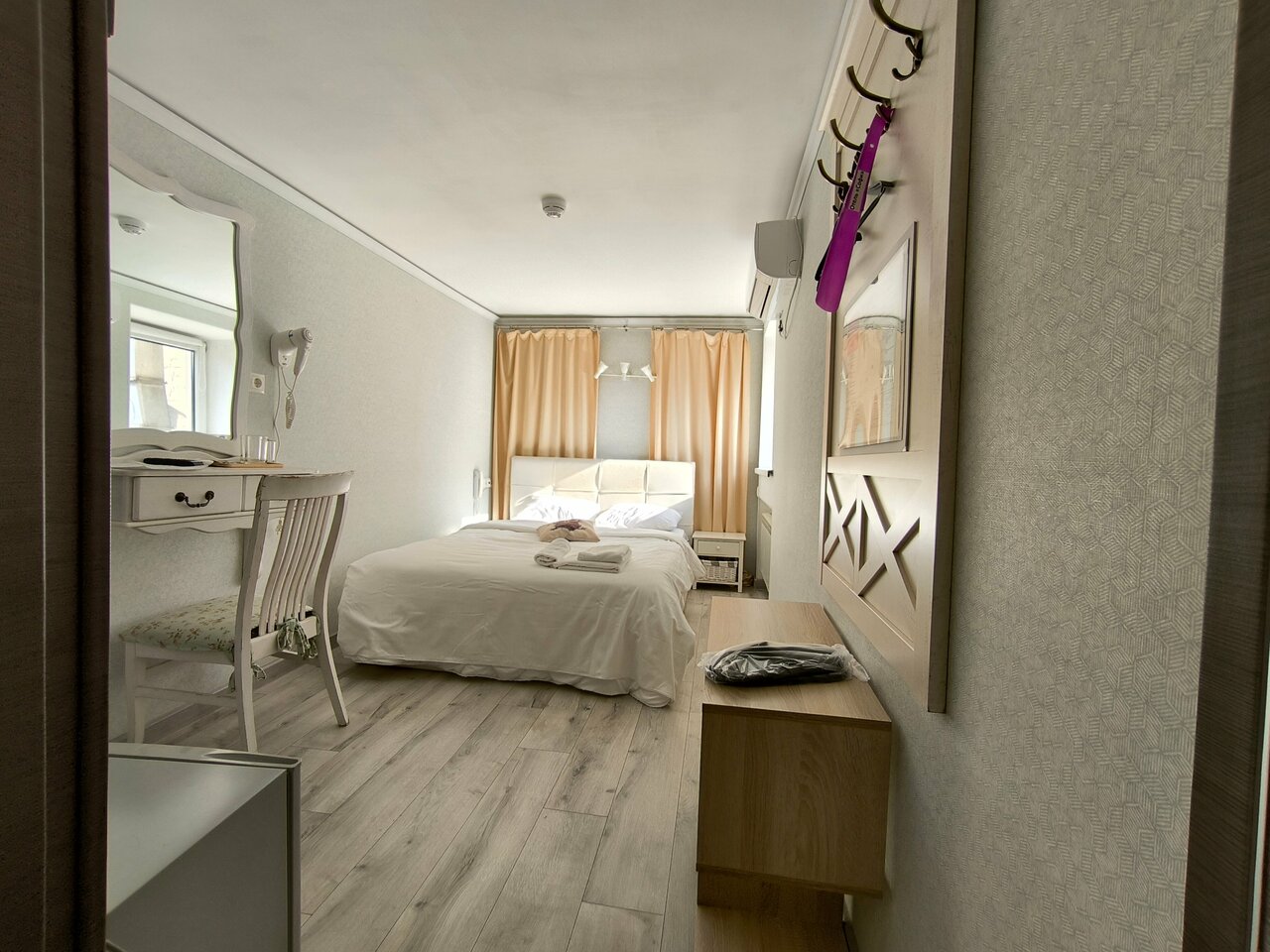 Комфортабельный номер с БОЛЬШОЙ кроватью.Есть все необходимое,телевизор чайник,полотенца,предметы личной гигиены,мини холодильник,кондиционер .Собственная ванная комната с душем.Бесплатный Wi-Fi.В номере два окна.10 мин. пешком до Кремля.
