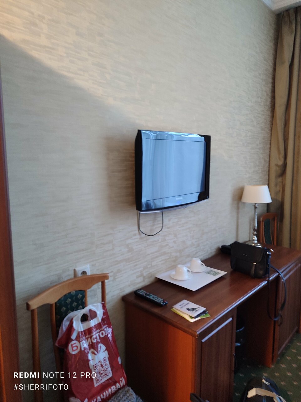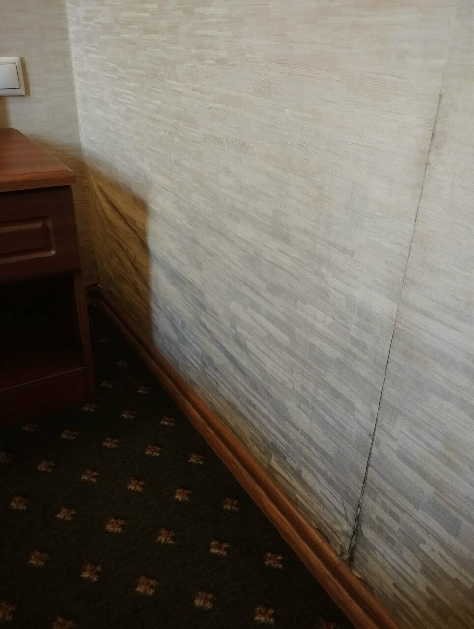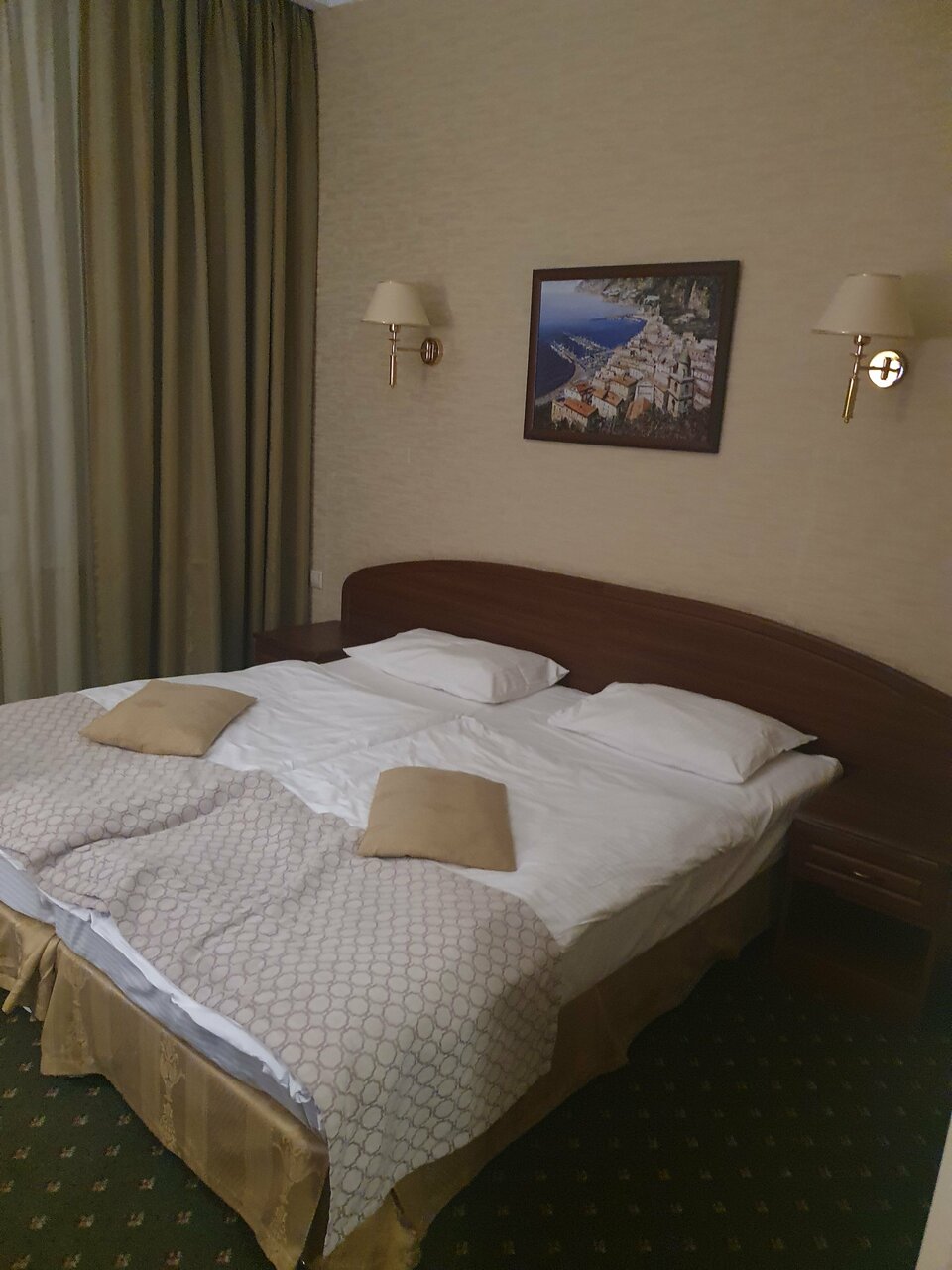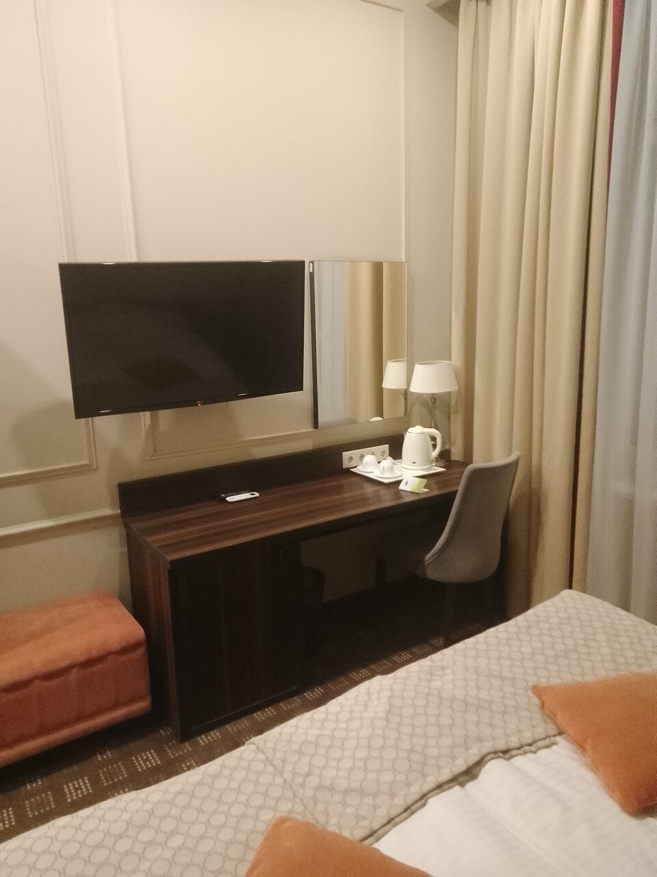 Состояние номера потрепанное,раковина оторвана от стены, опасался опереться.пульт от телевизора грозит развалиться в руках,температура была избыточная ,закрыть батарею не получилось,не работали краны.В номере не было ничего кроме одежной щетки,очень не хватало аксессуаров для обуви и сланцев.Кровать тоже в плачевном состоянии,обивка содрана и заменена куском ткани. Первое впечатление как бы неплохо,но не за этот ценник.
