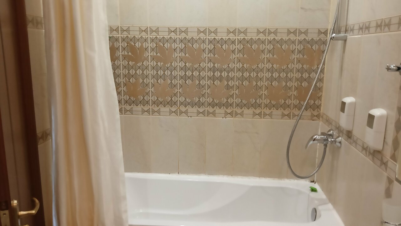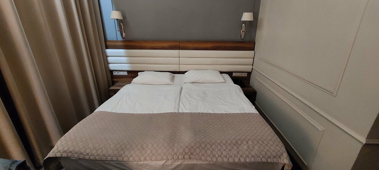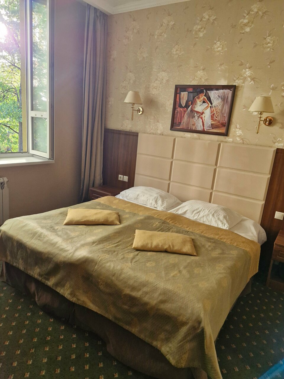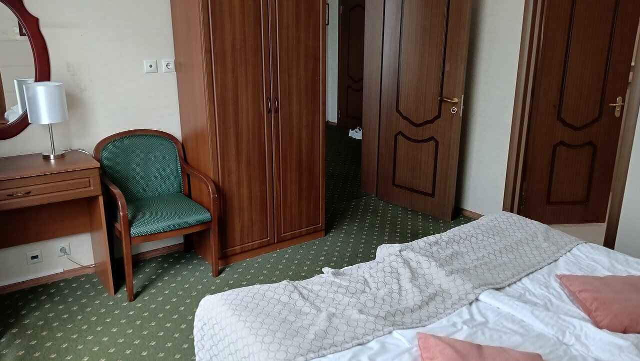 Состояние номера потрепанное,раковина оторвана от стены, опасался опереться.пульт от телевизора грозит развалиться в руках,температура была избыточная ,закрыть батарею не получилось,не работали краны.В номере не было ничего кроме одежной щетки,очень не хватало аксессуаров для обуви и сланцев.Кровать тоже в плачевном состоянии,обивка содрана и заменена куском ткани. Первое впечатление как бы неплохо,но не за этот ценник.