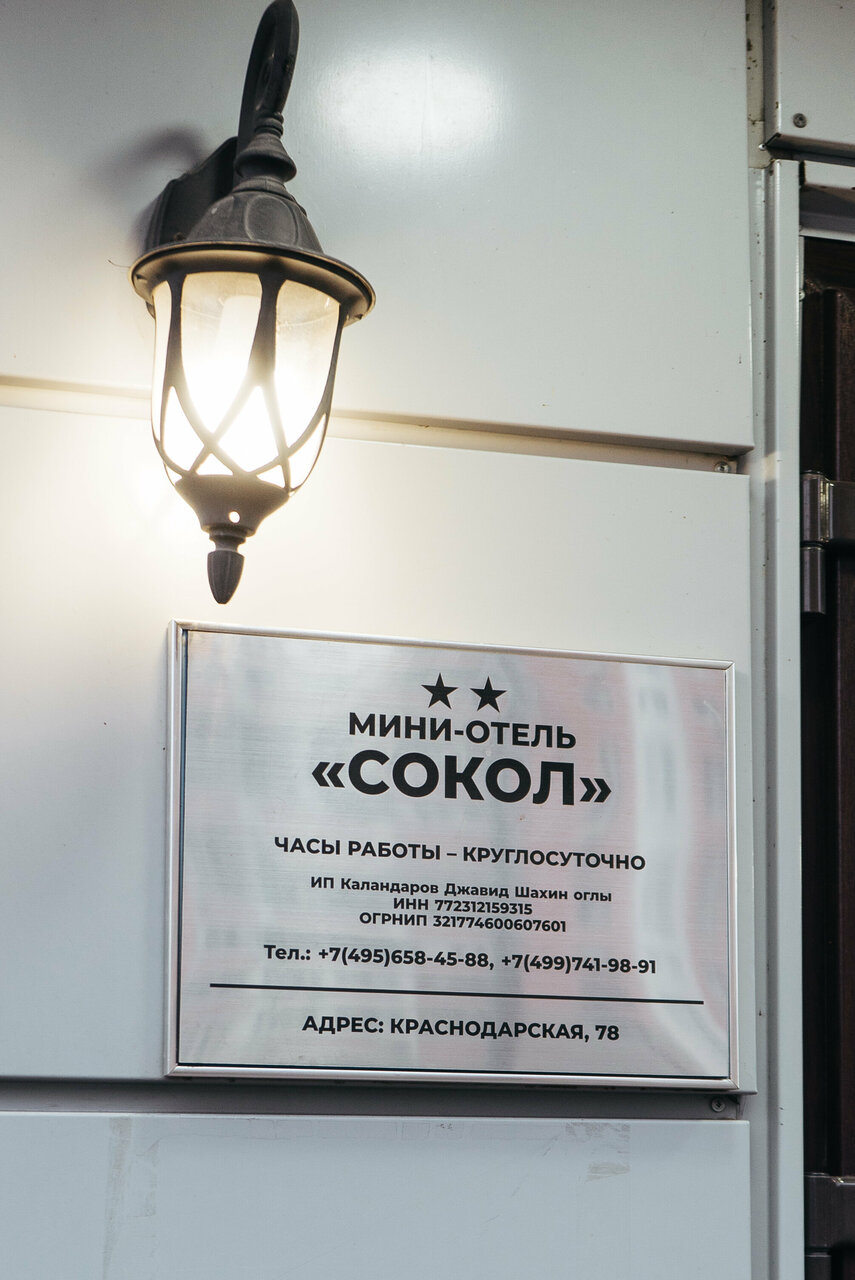Гостиница «Сокол» (Москва, Краснодарская ул., 78) — двухзвездочный отель с круглосуточным режимом работы. Предоставляет номера на час и для ночлега (от 2500 до 5000 ₽/ночь). Услуги включают парковку, Wi-Fi. Контакты: +7 (499) 741-98-91, +7 (495) 658-45-88.