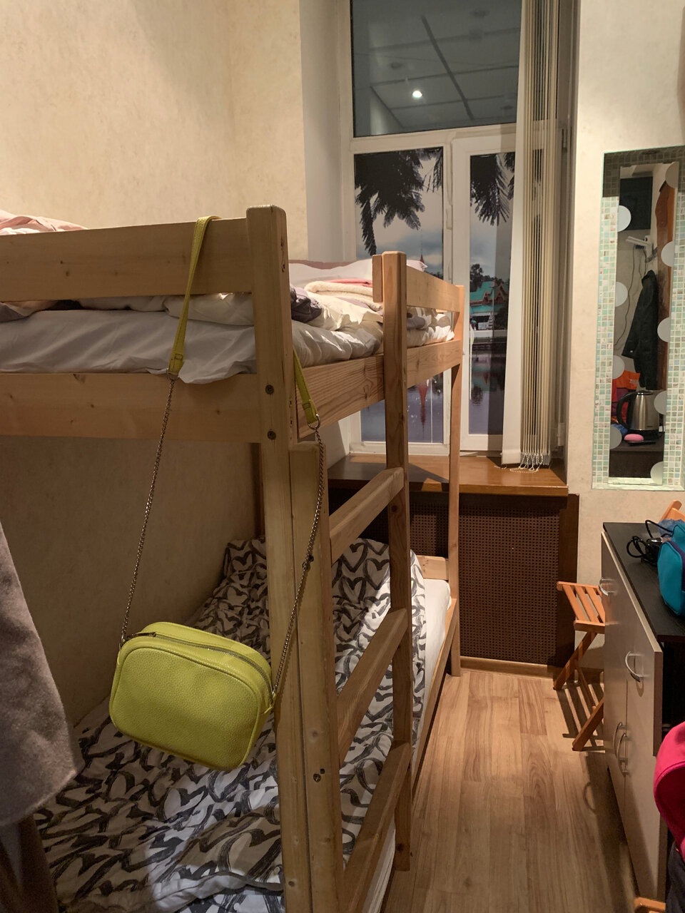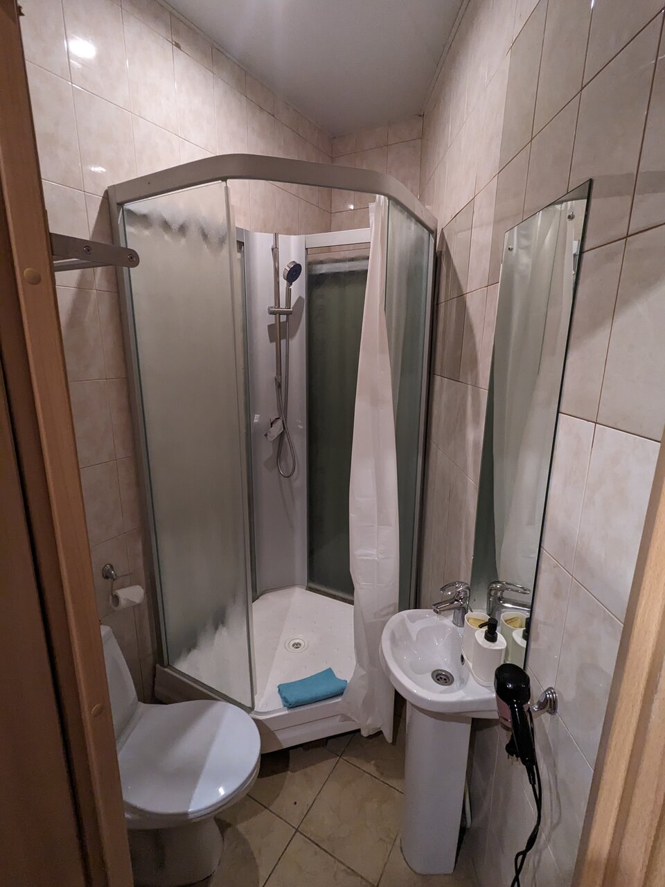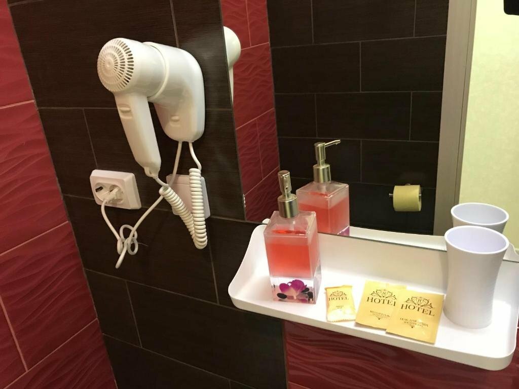 Персонал в гостинице возмущается, если ночью тебе захочется курить (с претензиями). В душе холодно, приходится включать обогреватель, что не выглядит безопасным.(см.фото). Единственное, почему удлинитель не упадет в душ, это потому, что за 5 минут активного слива воды она не нагрелась ни на градус (при этом в раковине горячая вода есть). Мебель достаточно ушатана, 1 балл чисто за расположение. И да, это номер Делюкс.