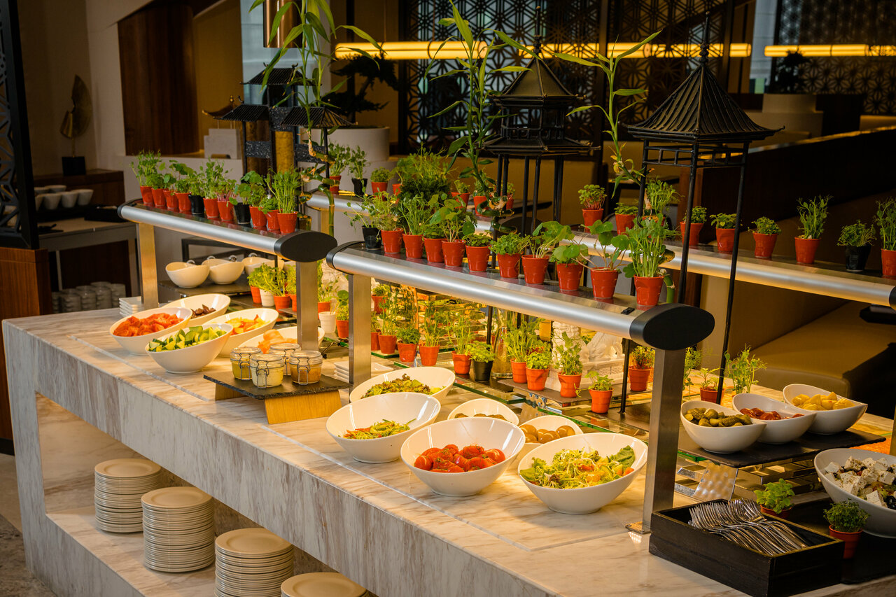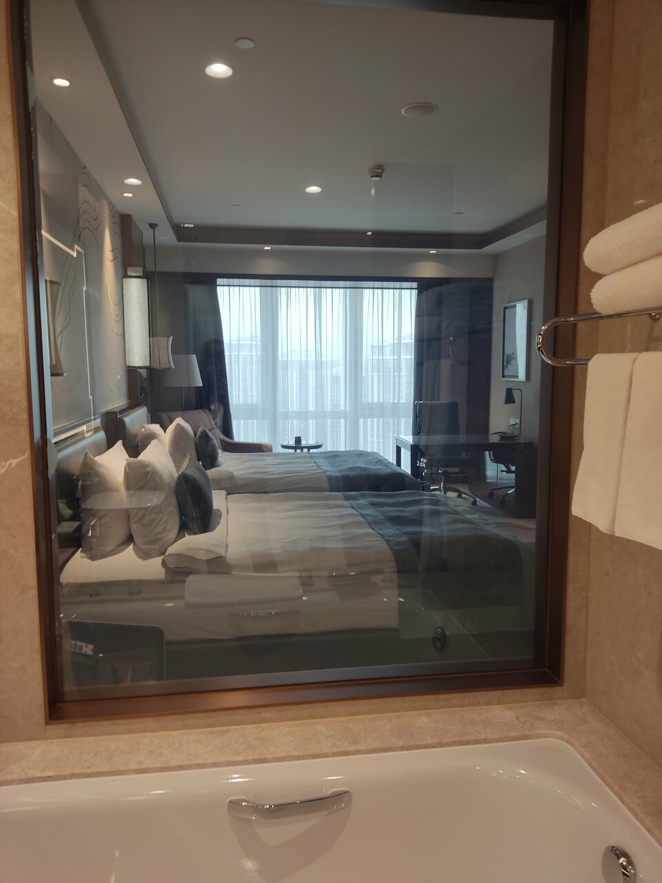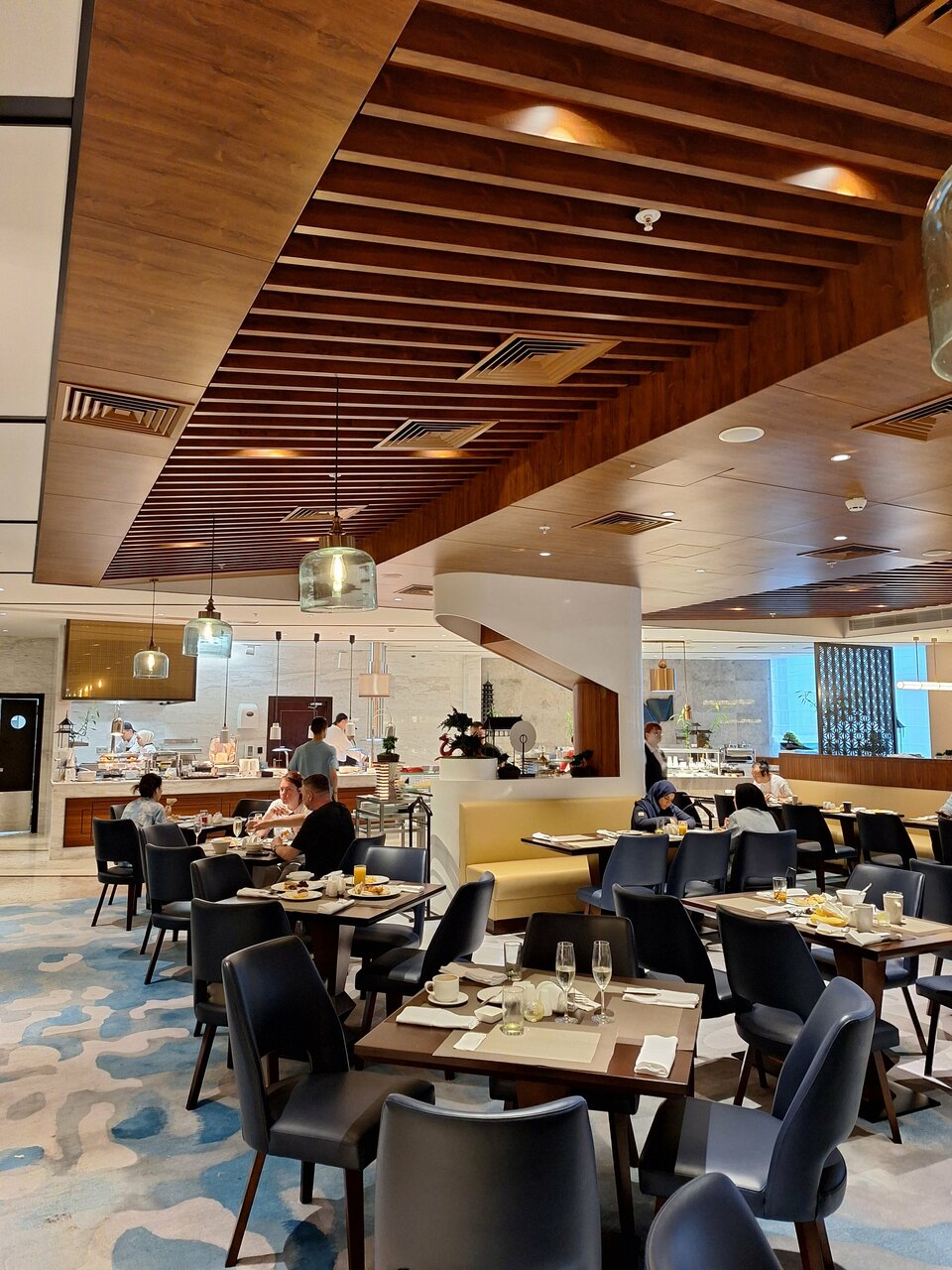 Очень красивый отель! Новый, потрясающие виды. В номере автоматические карнизы, тёплый пол в ванной, всевозможные варианты подсветок. Завтраки самые лучшие, где мы были — можно заказать яичницу, китайскую лапшу в воке. Есть блинчики, несколько видов фрешей, разные виды рыбы, каши, вторые блюда. Но как оказалось, на завтрак можно войти только один раз. Второй раз выпить кофе уже нельзя. Было бы здорово предупреждать о таком заранее, так как это первый отель такого уровня с такой поправкой. Сухо да, действительно — моя атопичная кожа жутко страдала. И обратите внимание, что зоны спа вообще нет. Есть возможность за доп плату посетить Ворд класс. Только так. Несмотря на эти нюансы, звезды не снимаю, отель действительно классный.