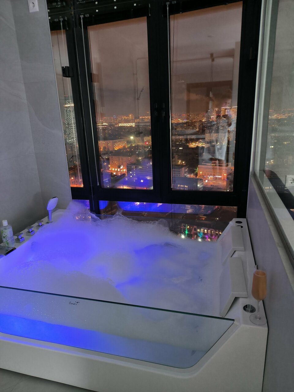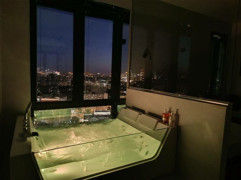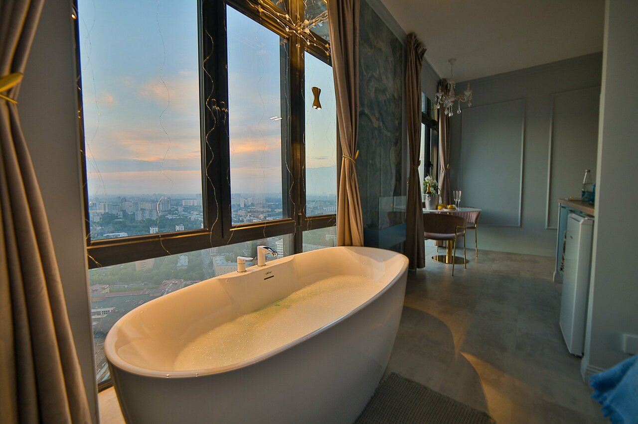 Посетили с девушкой и наш выбор пал на новый номер с джакузи. Когда мы сели в воду и увидели какой открывается вид из этого окна, просто ахнули! Это настолько необычно — сидеть в джакузи на высоте, смотреть на огни и чувствовать себя королями мира. В следующий раз обязательно возьмем этот номер снова!