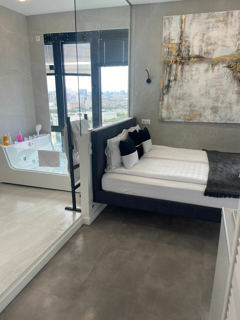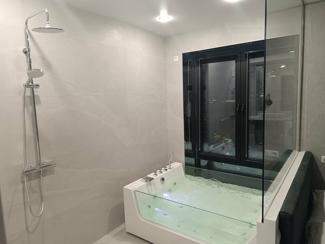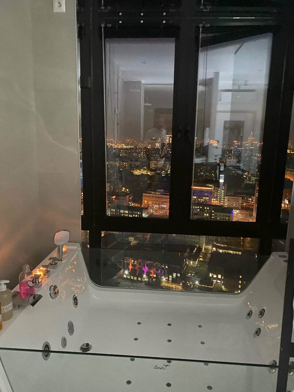 Посетили с девушкой и наш выбор пал на новый номер с джакузи. Когда мы сели в воду и увидели какой открывается вид из этого окна, просто ахнули! Это настолько необычно — сидеть в джакузи на высоте, смотреть на огни и чувствовать себя королями мира. В следующий раз обязательно возьмем этот номер снова!