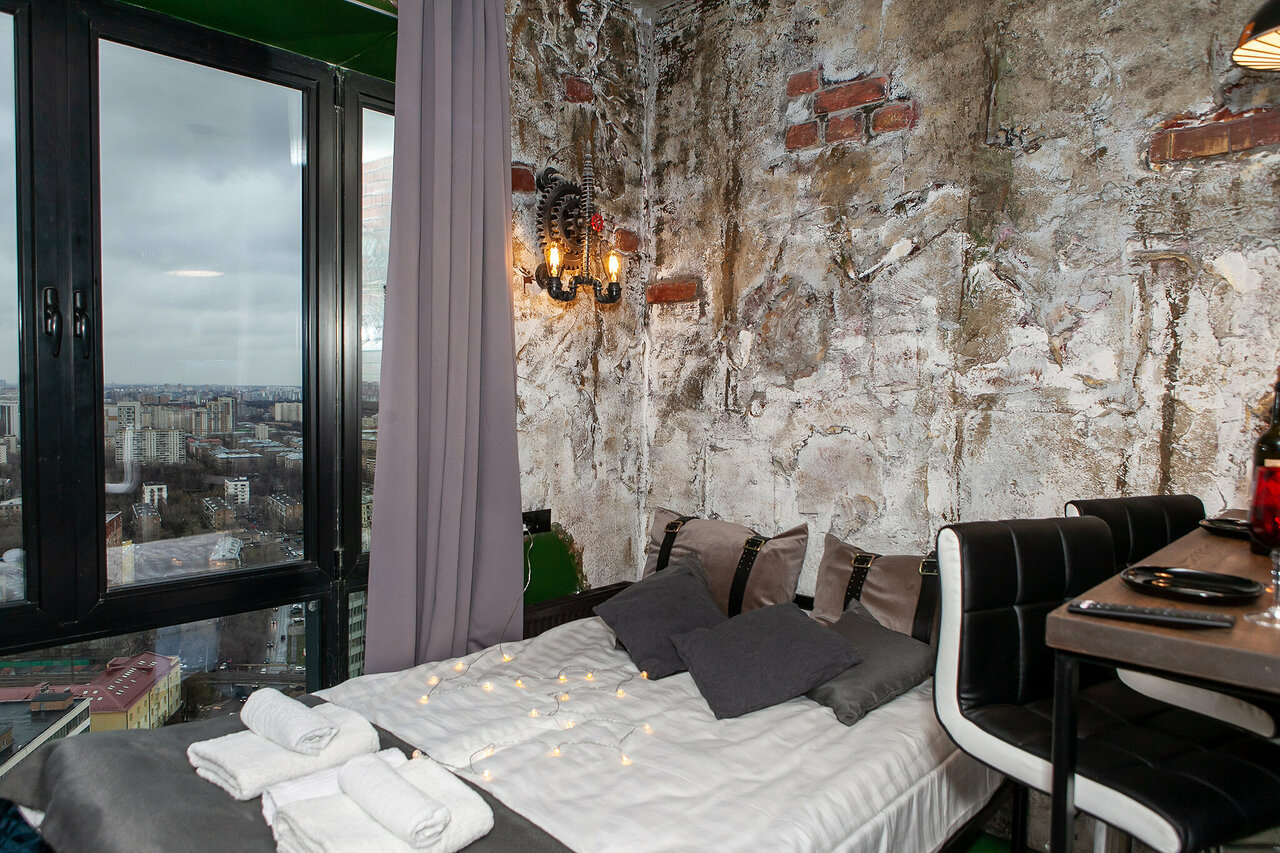 Вместимость: 2 взрослыхРазмер апартов: 25 кв мОсобенности: Душевая с окном в полный рост, панорамный вид на западную часть Москвы (Москва Сити, Университет и др.)Остекление – окна в пол.КаминЭтаж: 38