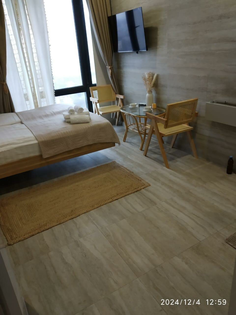 Кровать: одна двухспальнаяВместимость: 2 взрослыхРазмер апартов: 20 кв мОсобенности: Большой холодильник,душевая комната отделанная мозайкой,панорамное остеклениеЭтаж: 30