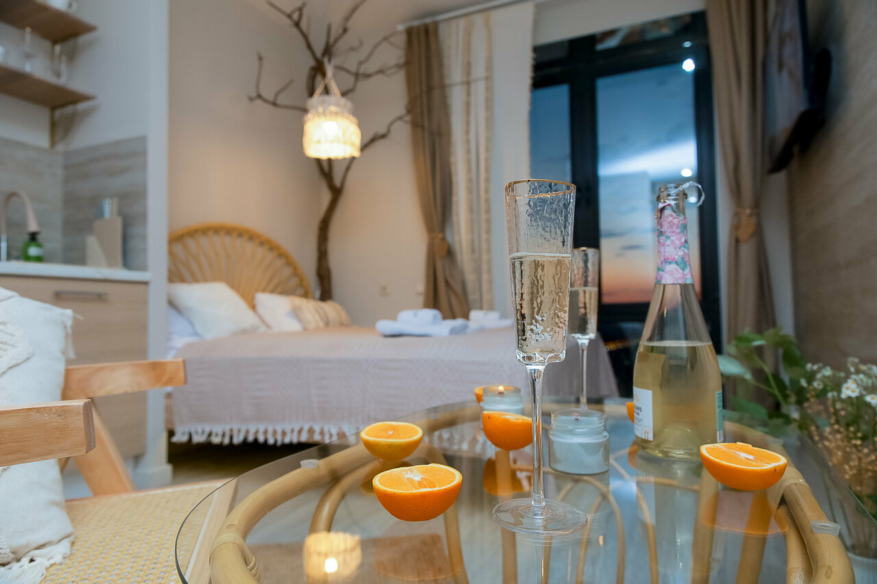 Вместимость: 2 взрослыхРазмер апартов: 21 кв мОсобенности: Использование натуральных материалов и растительных мотивов в отделке. Качели рядом с окном.Остекление – окна в пол.