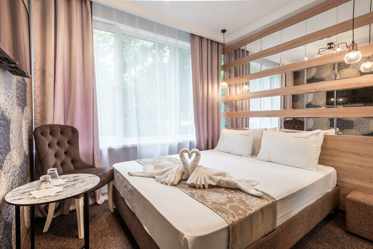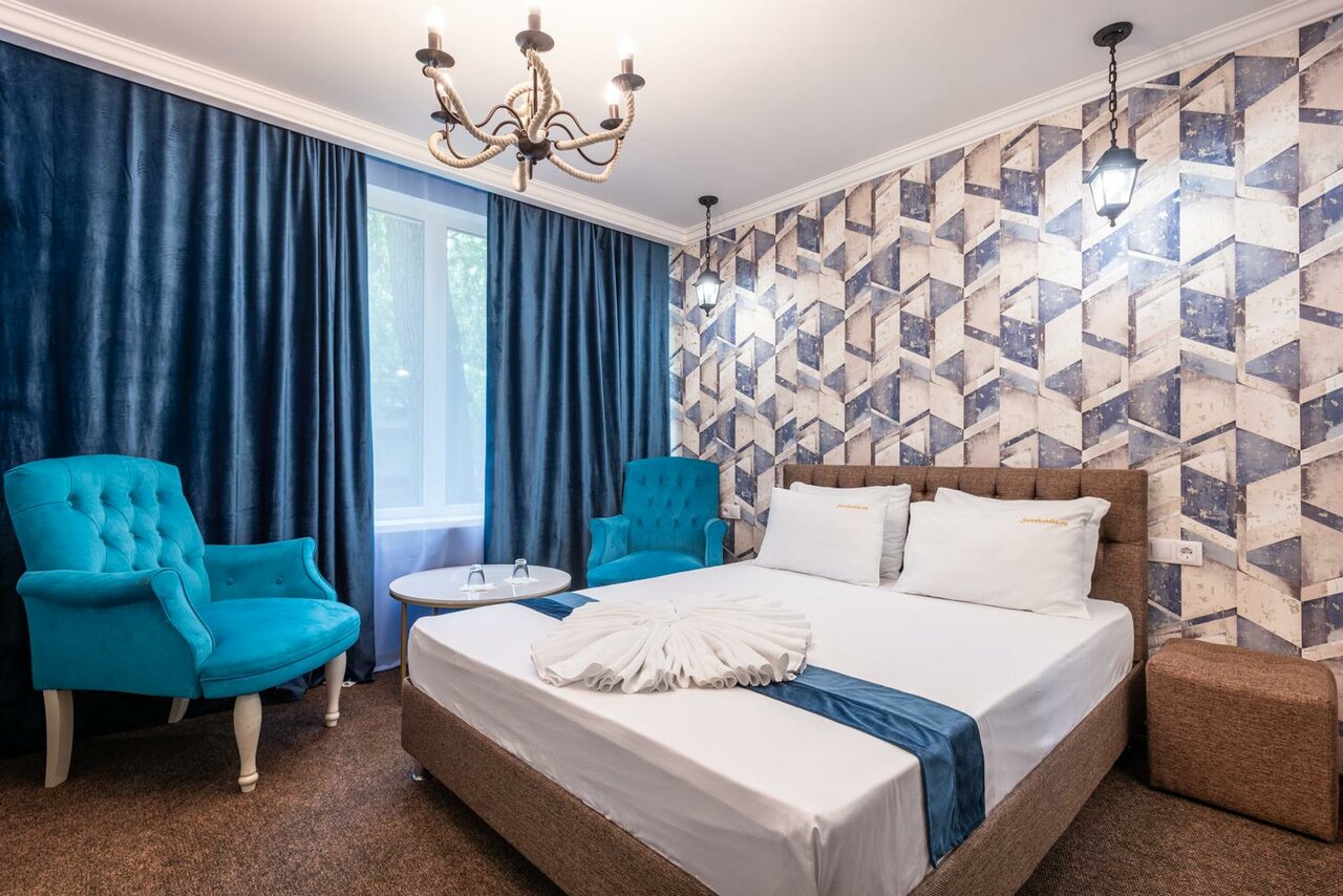 Номер оснащен всем необходимым для комфортного проживания. В номере большая двухспальная удобная кровать с прикроватными тумбочками, шкаф купе с вешалками, холодильник ,ТВ, дизайнерский столик с банкеткой, кондиционер. Эти номера очень востребованы