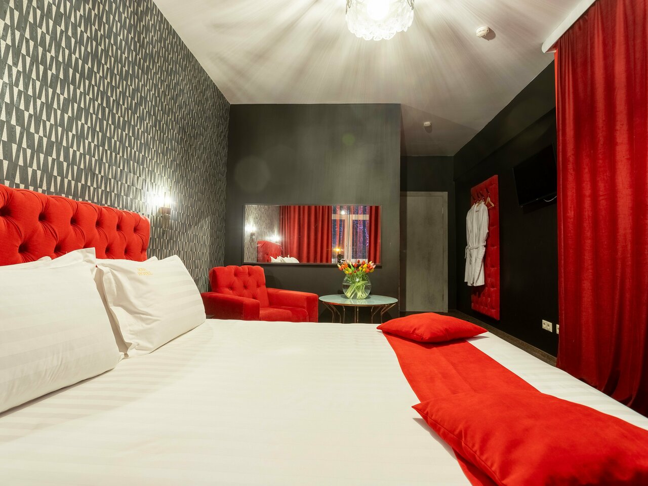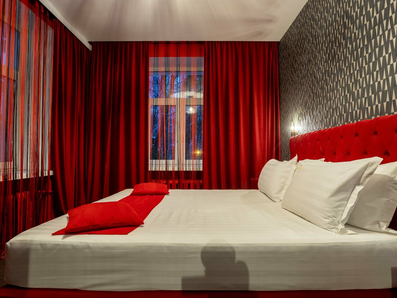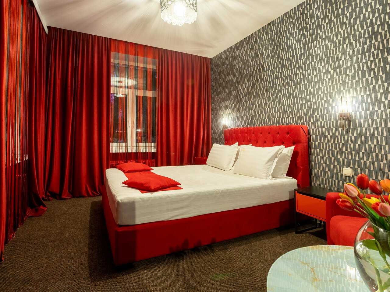 Люкс - это самый удаленный от ресепшена просторный номер, с большой двуспальной кроватью, более стильно и романтично выглядит , в номере появляются дополнительные удобства : зона отдыха состоящая из столика и мягких кресел, тапочки, шкаф купе веша...