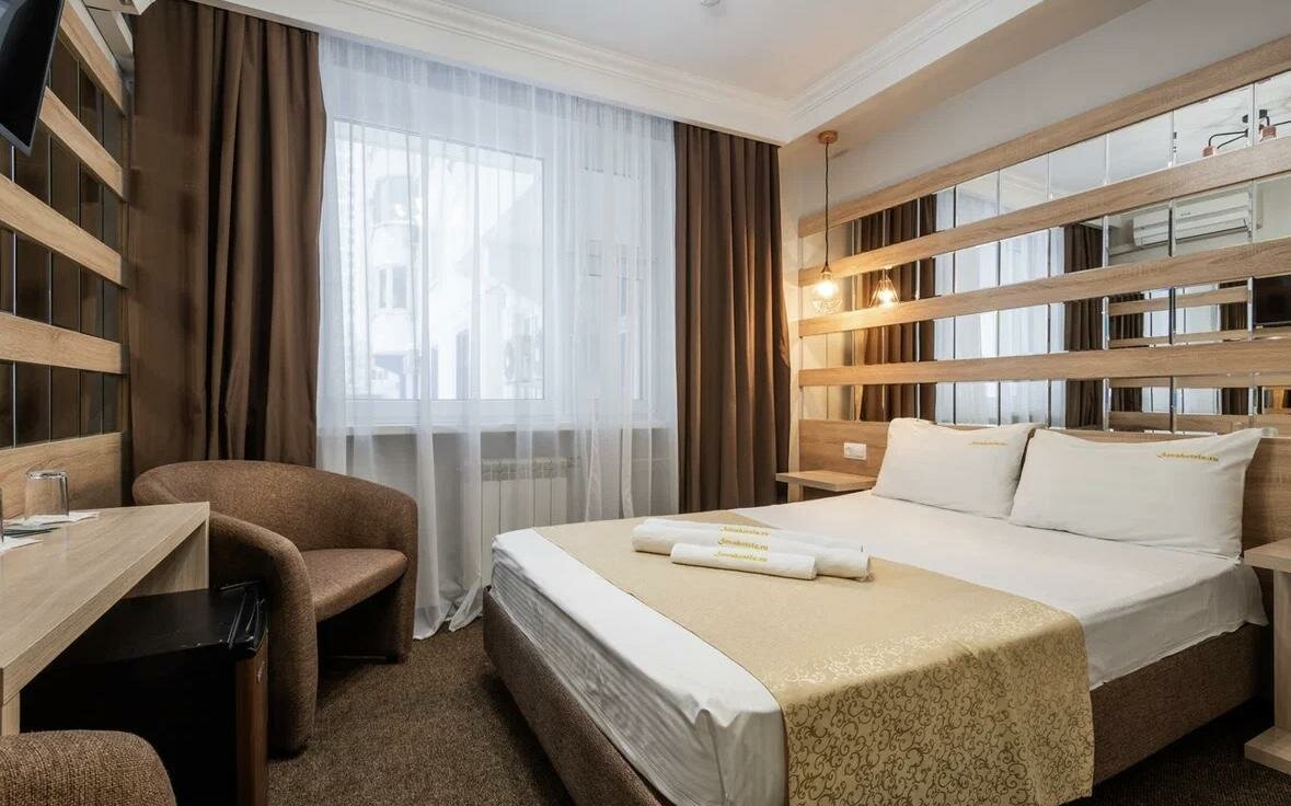 Это самый наш небольшой и скромный номер, но как и в любом номере , порядок , чистота , красота и уют ждут Вас!В номере большая двухспальная кровать с прикроватными тумбочками , шкаф купе с вешалками, холодильник , ТВ, дизайнерский столик с банке...