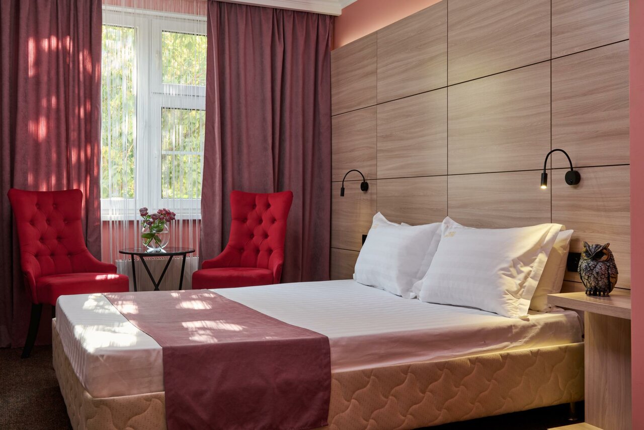 Номер оснащен всем необходимым для комфортного проживания. В номере большая двухспальная удобная кровать с прикроватными тумбочками, шкаф купе с вешалками, холодильник ,ТВ, дизайнерский столик с банкеткой, кондиционер. В ванной комнате есть душева...