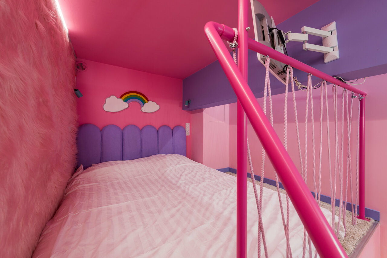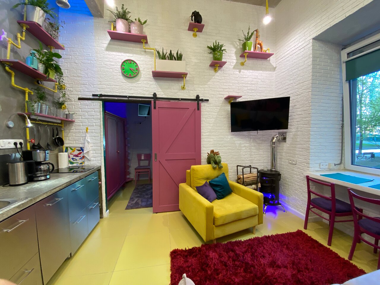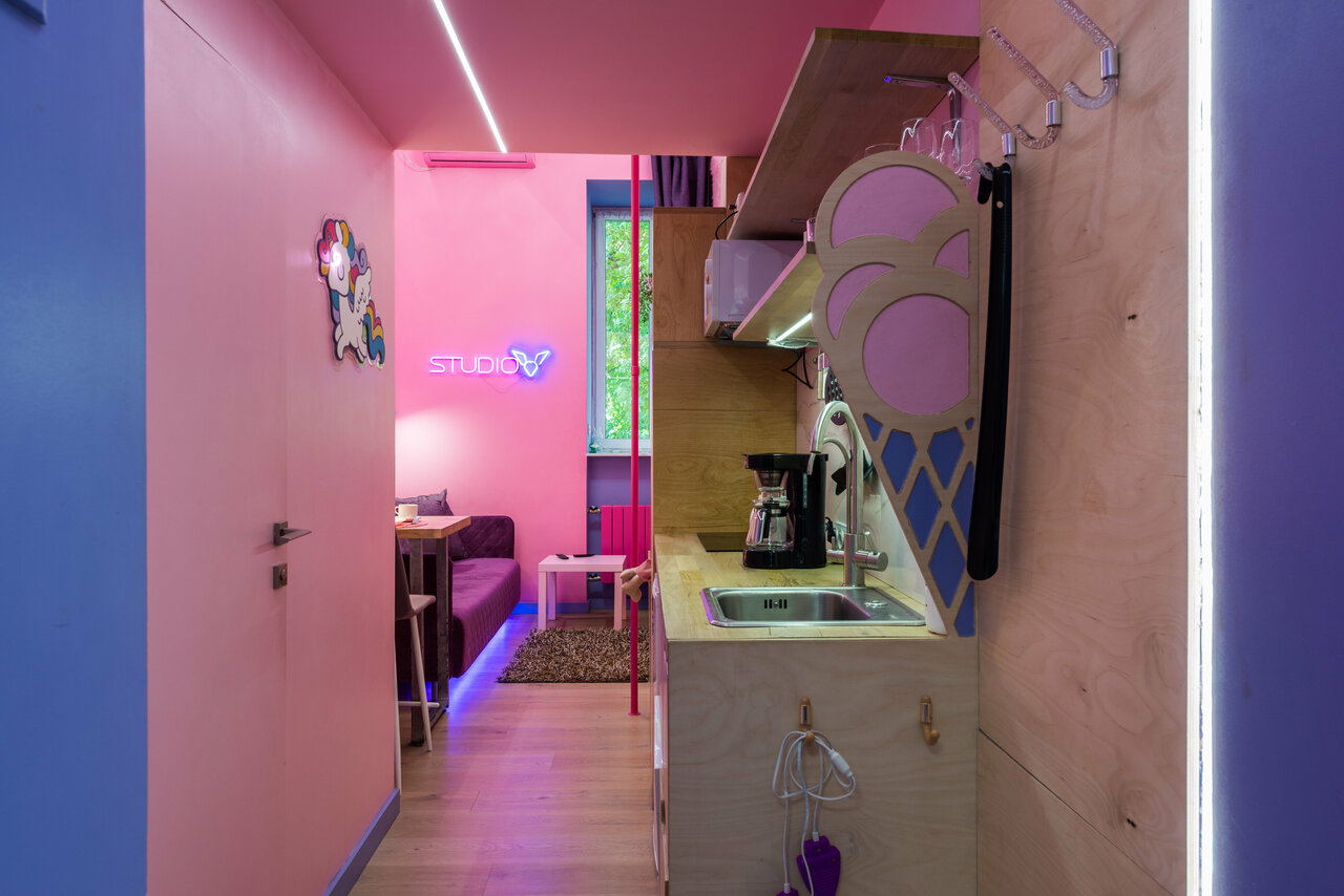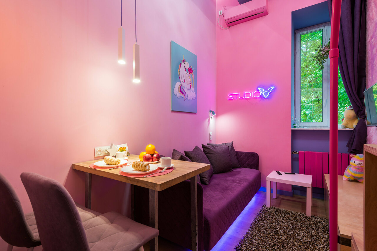 Второй раз были в апартаментах. Первый пару лет назад в ботанике, сейчас в розовом безумии с единорогами и радугой. Один восторг! Жили сейчас с дочерью вдвоем. Остались очень довольны. Компактно, но не тесно. Кровать под потолком, пушистая розовая огромная стена. Подушки отдельная благодарность В зоне кухни есть все необходимое и даже больше. В ванной шампунь, гель, кондиционер, ватные палочки, диски, мицелярка, гель для умывания, щетки паста. Все нужное есть. Эти апартаменты не просто жилье, а часть развлекательной программы, на столько там классно. Спасибо за уют