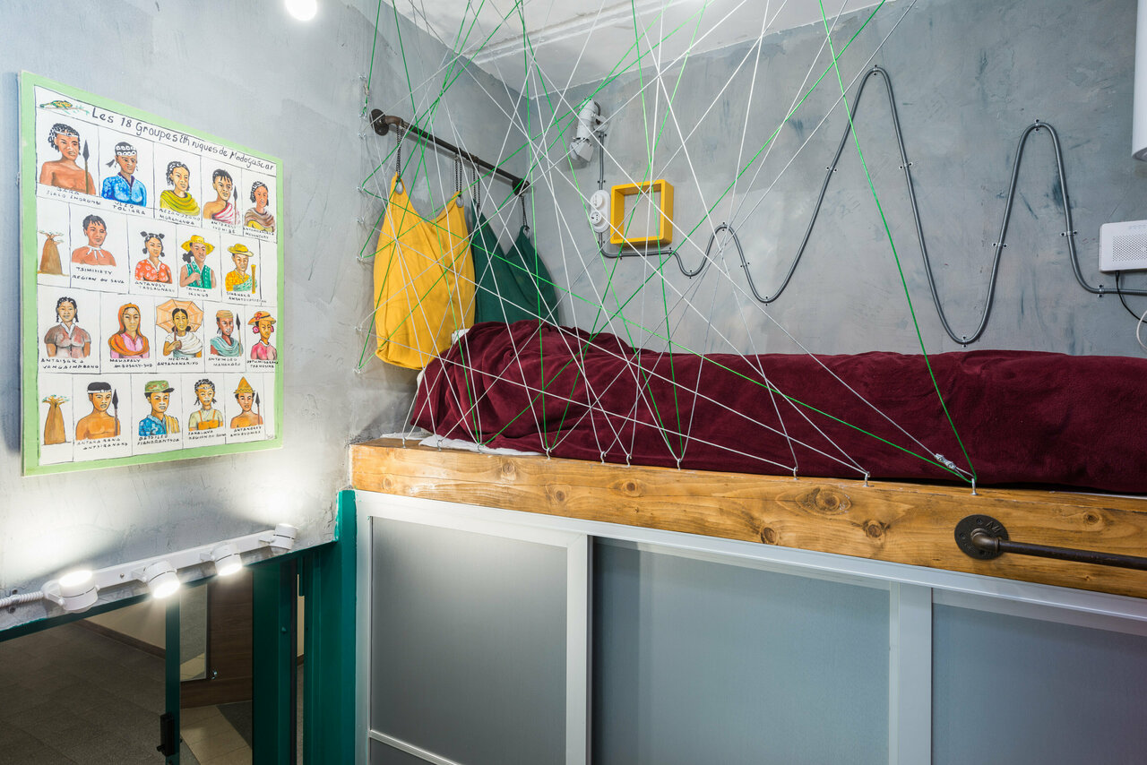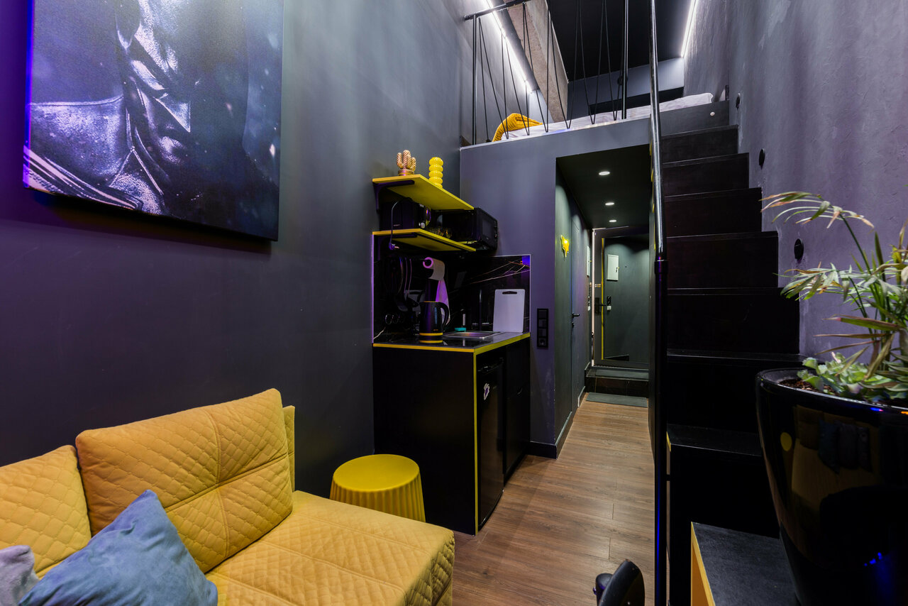 Мини студия, которую я занимала, трудно таковой назвать. При входе сразу начинается винтовая лестница, ведущая на второй этаж — собственно жилое помещение, полезная площадь которого составляет 2,5 метра на 2. Большую часть которой занимает матрас на полу, т.е. кровать в притык к ней тумбочка со столовыми приборами, с другой стороны металлический столик с чайником. И откатывающаяся дверь, отделяющая унитаз с раковиной. Вентиляция отсутствует, есть кондиционер (давно не чищенный) запах затхлости. Высота потолка не более 155 см, приходилось ходить согнув голову. Месторасположение бесспорно отменное, близко станция метро, продовольственные магазины.