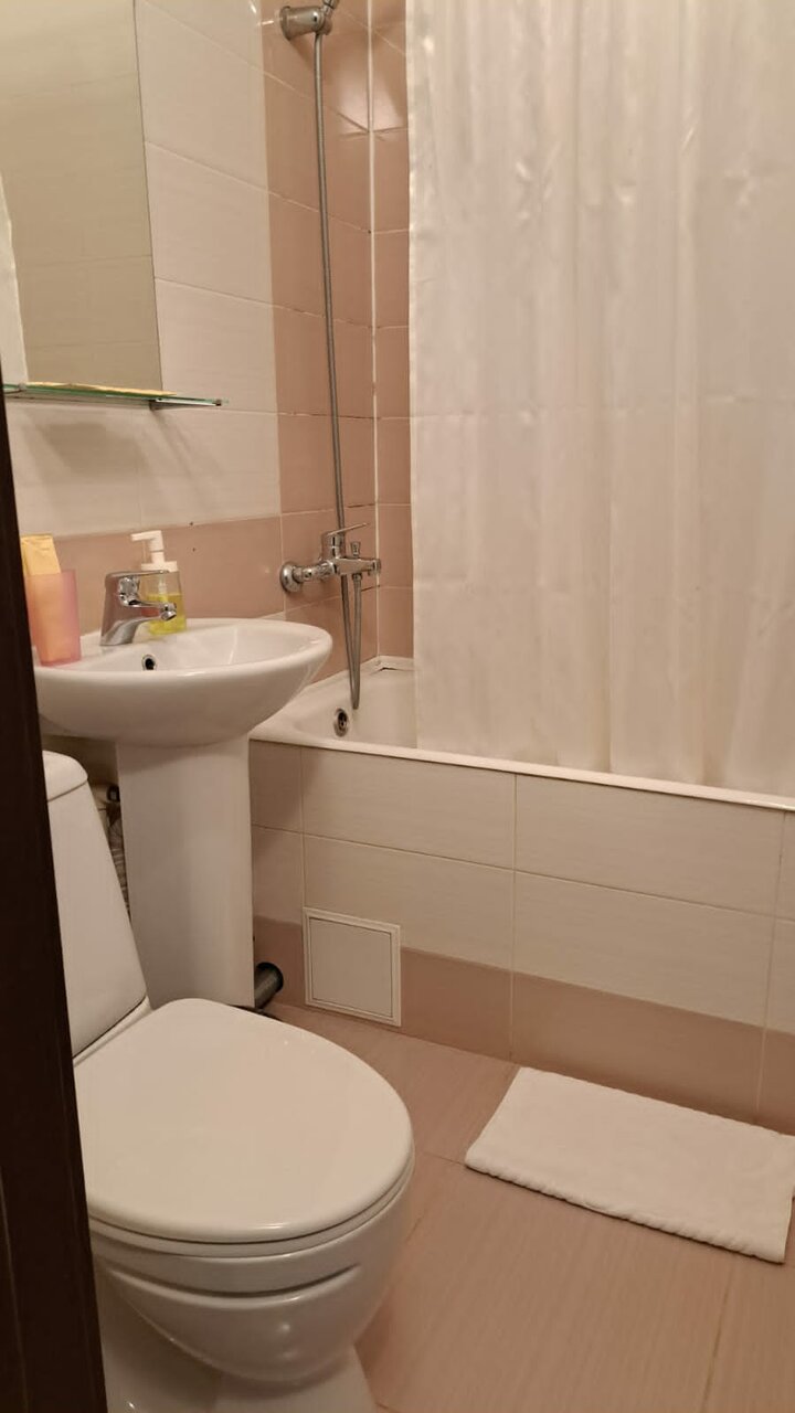 Находится в пятиэтажном кирпичном доме.машиноместо было в общем дворе.детская площадка тоже во дворе общая.в номере ванна.унитаз.телевизор.холодильничек.Приятно удивило наличие чая и кофе и кулера рядом с номером в коридоре в полном доступе для всех.Каждый день ложили нам одноразовый шампунь и гель для душа .До метро идти минут 10-15 не спеша.все в общем нормально